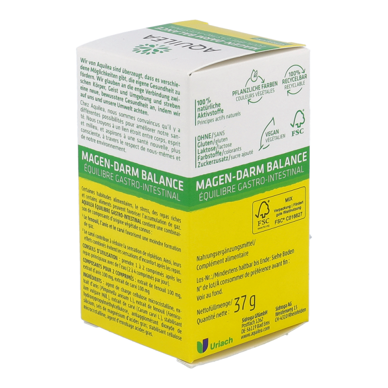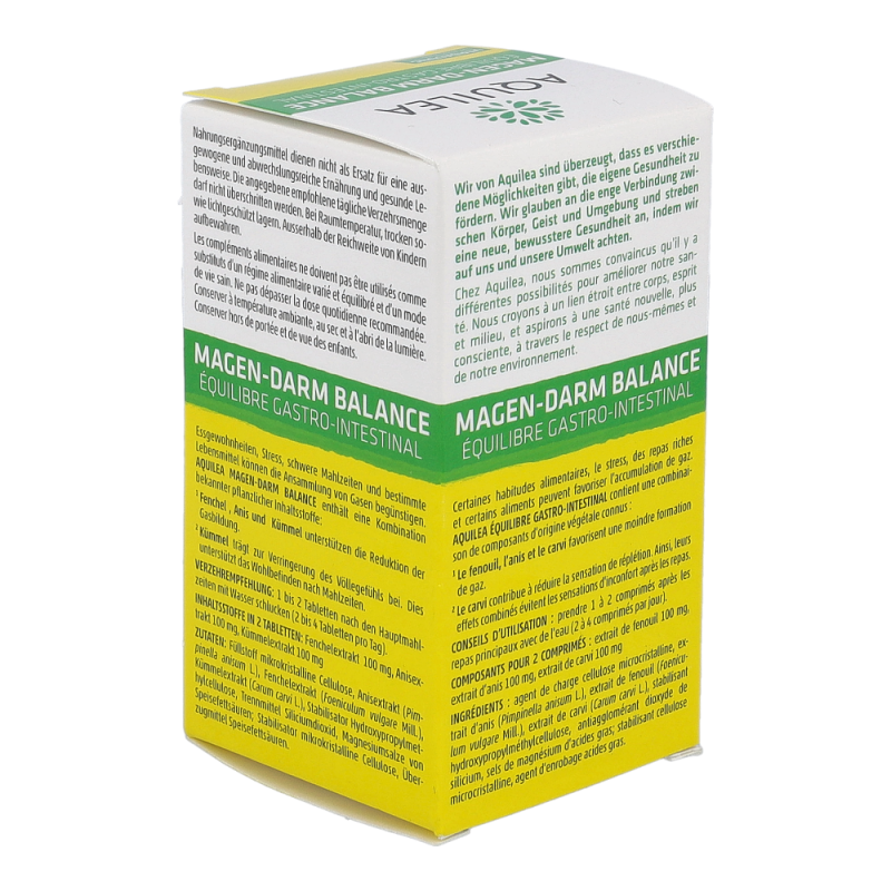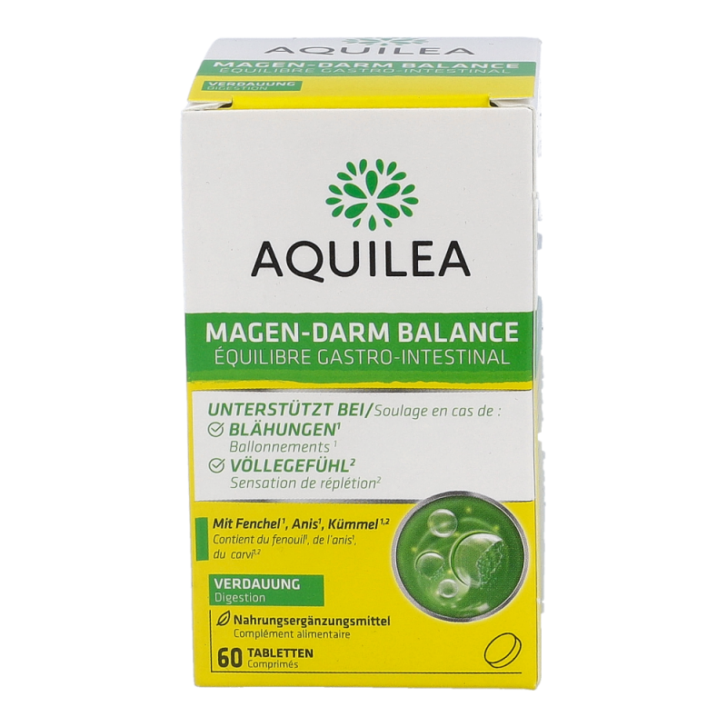 Dank seiner ausgewählten Pflanzenkombination bietet Aquilea Magen-Darm Balance ein angenehmes Gefühl nach dem Essen, insbesondere nach schwer verdaulichen Speisen, und unterstützt die Reduktion von Blähbauch und Völlegefühl.