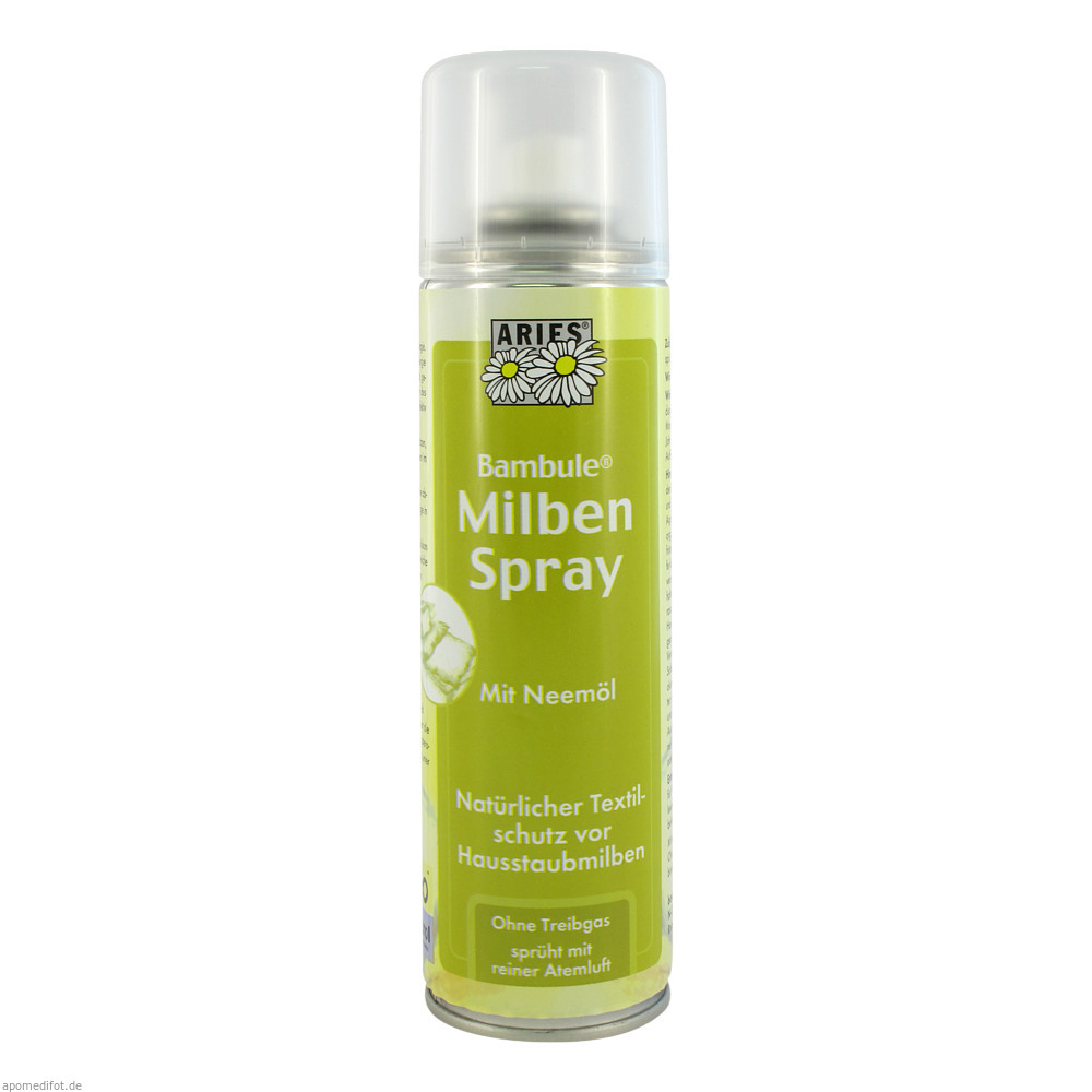 Aries Bambule Milbenspray 200ml schützt Matratzen, Decken, Teppiche und sonstige Textilien im Wohnbereich. Der Neemextrakt, gewonnen aus den Blättern und Samen des indischen Neembaumes, bekämpft effektiv die schädlichen Milben. Dieses Produkt erhalten Sie in den Packungsgrößen 50 ml und 200 ml.