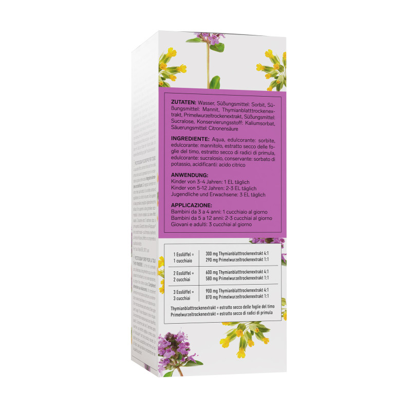 Während die Primel die Bronchialschleimhäute dazu anregt mehr Schleim zu produzieren, was zu einer Erleichterung des Abhustens führt, sorgt der Thymian für eine hustenlindernde und schleimlösende Wirkung.