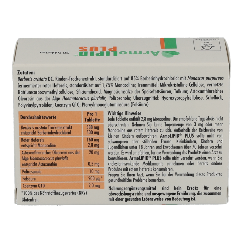 Es gibt Menschen, die auf die Inhaltsstoffe von Rotem Hefereis mit Muskelbeschwerden reagieren. Diese Unverträglichkeit ist abhängig von der Menge. ArmoLIPID® PLUS enthält eine sehr geringe Menge an Rotem Hefereis mit 2,8 mg Monacolin K pro Tablette (Tagesdosis). Bei sehr sensiblen Personen können jedoch selbst bei dieser geringen Menge Muskelbeschwerden auftreten.