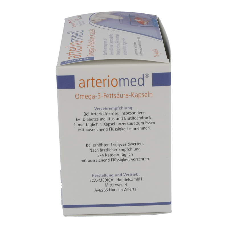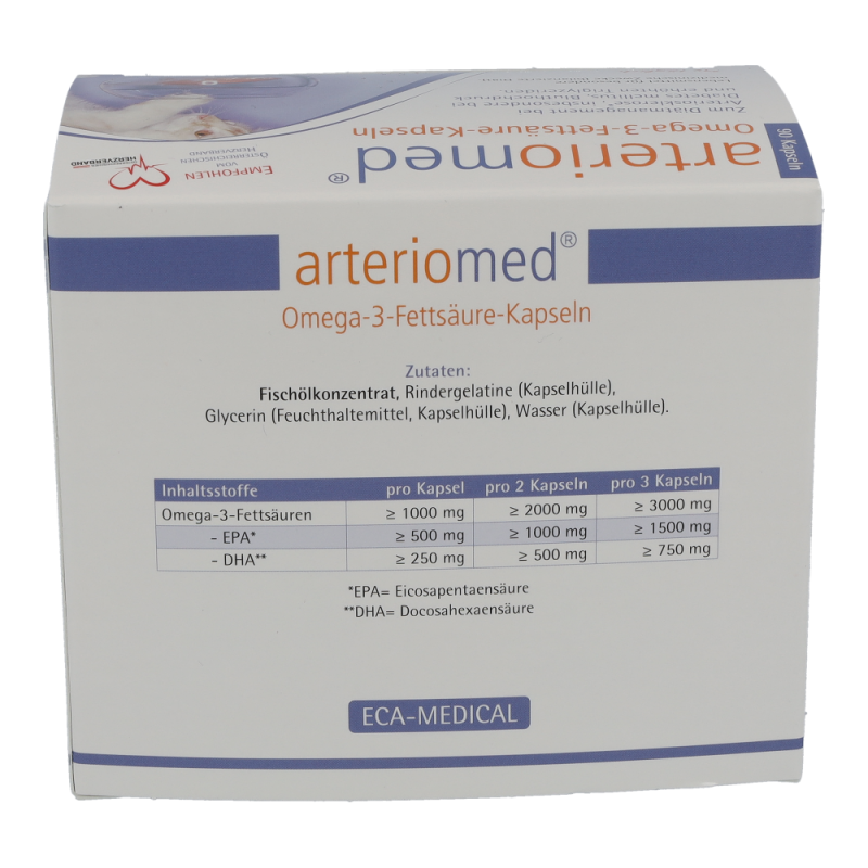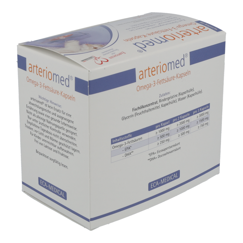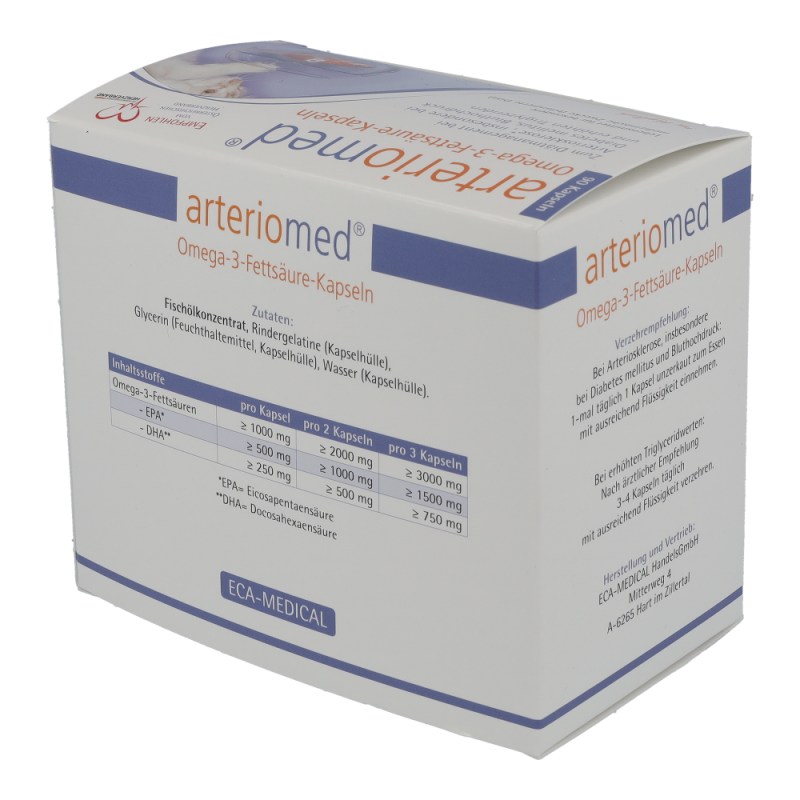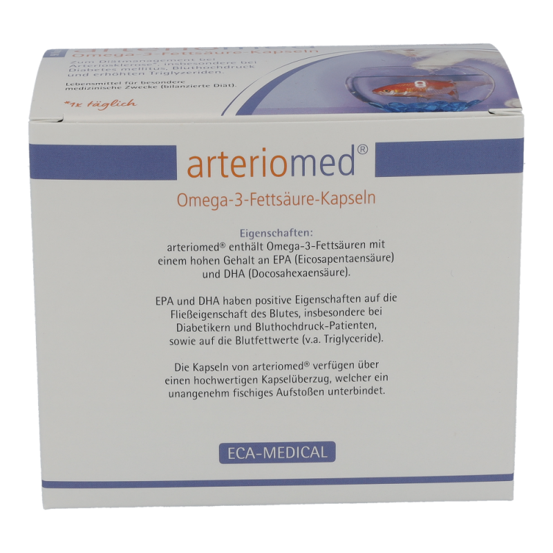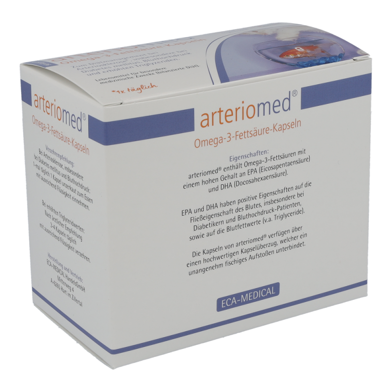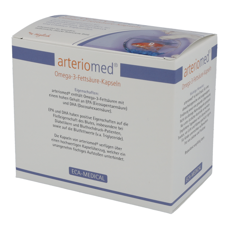Arteriomed Fischöl-Kapseln dienen der diätischen Behandlung von Arteriosklerose und Störungen des Fettstoffwechsels. Insbesondere bei Diabetes Mellitus. Zudem schützen sie Herz und Gefäße und verbessern die Fließeigenschaften des Blutes. Die Kapseln senken außerdem den Blutdruck und regulieren den Cholesterinspiegel. Dieses Produkt ist in Packungen zu 30 und 90 Stück erhältlich.