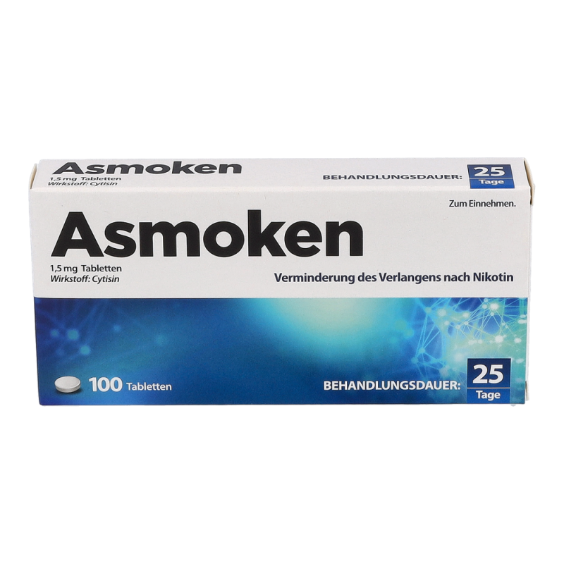 Asmoken enthält kein Nikotin, sondern den Wirkstoff Cytisin. Dieser ist rein pflanzlich und gut verträglich. Cytisin verdrängt während der Behandlung das Nikotin schrittweise aus Ihrem Körper. Am Anfang der 25 Tage sollte man bis zu 6 Tabletten am Tag nehmen. Danach immer weniger, bis man am Schluss nur noch 1 oder 2 Tabletten am Tag braucht. Am Ende sind Sie vom Nikotin entwöhnt. Nach Beendigung der 25-tägigen Behandlung wird das Cytisin aus dem Körper ausgeschieden, und Sie verspüren kein Verlangen mehr nach Nikotin. Eine Packung Asmoken (100 Tabletten) reicht für die vollständige Behandlung von 25 Tagen aus. Die Tabletten werden mit einer ausreichenden Menge Wasser eingenommen.