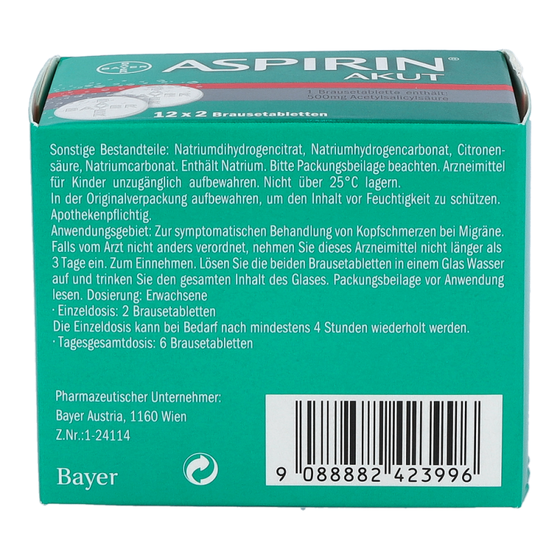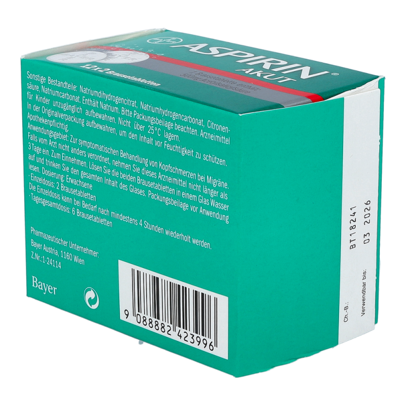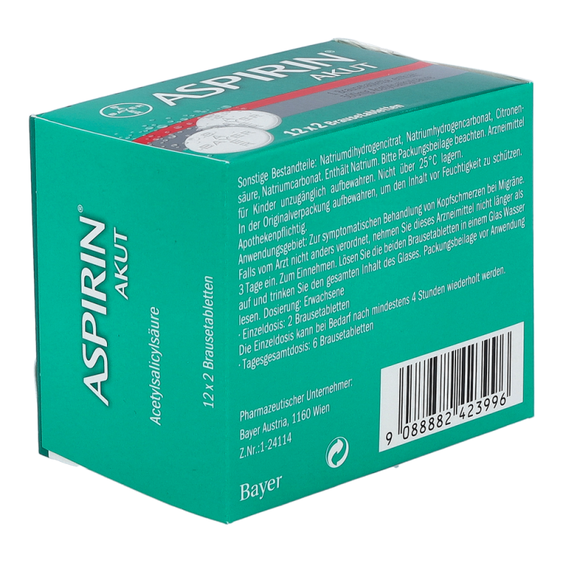 Aspirin Akut Brausetabletten von Bayer sind ein schmerzstillendes, fiebersenkendes und entzündungshemmendes Arzneimittel. Sie dienen zur symptomatischen Behandlung von Kopfschmerzen bei Migräne.
