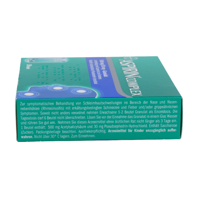ASPIRIN® Complex Heißgetränk hat schmerzlindernde, entzündungshemmende, fiebersenkende und nasenschleimhautabschwellende Eigenschaften. Das Granulat wird angewendet zur symptomatischen Behandlung von Schleimhautschwellungen im Bereich der Nase und Nasennebenhöhlen (Rhinosinusitis) mit erkältungsbedingten Schmerzen und Fieber und/oder grippeähnlichen Symptomen.