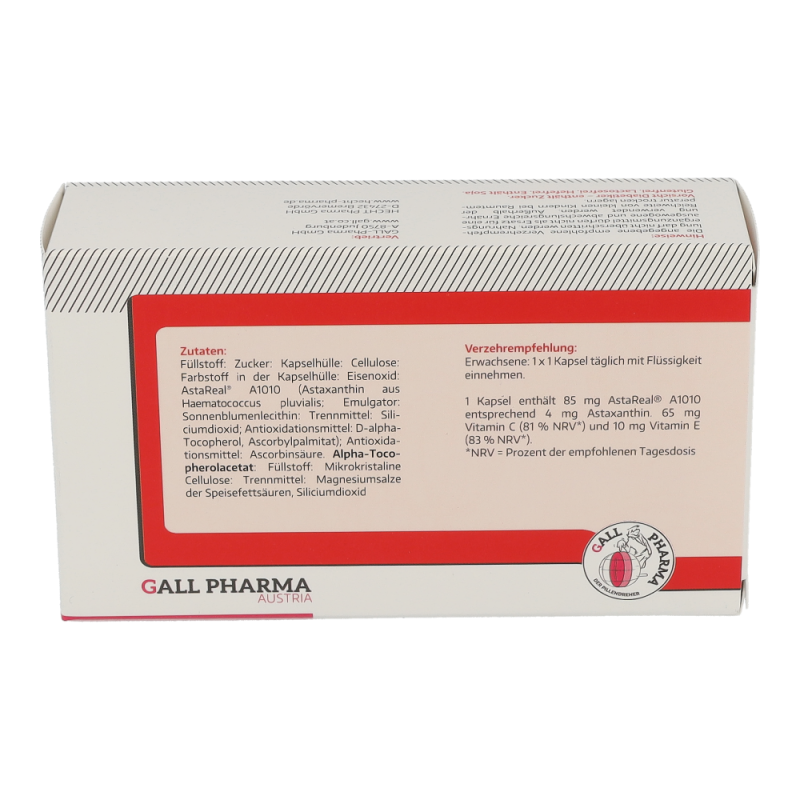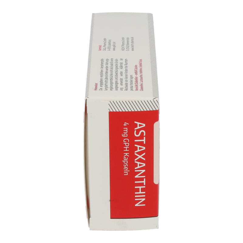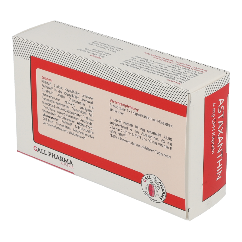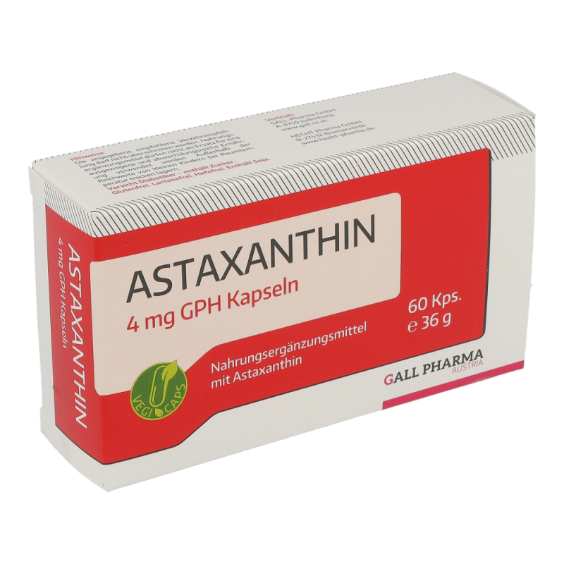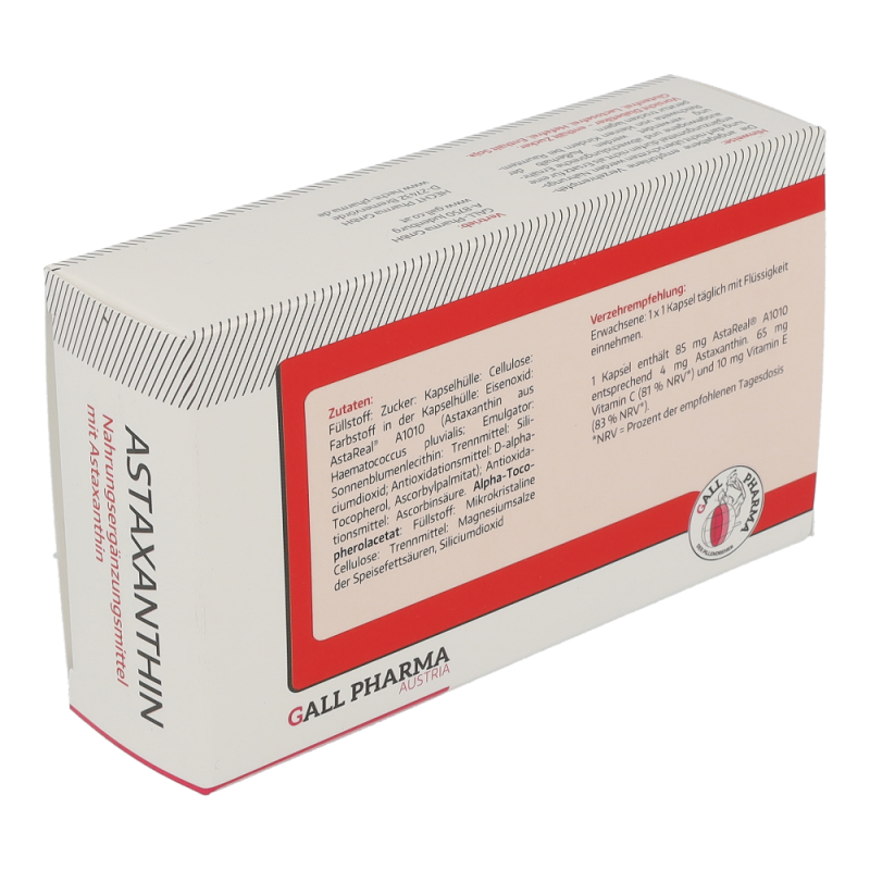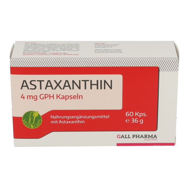 Gall Pharma Astaxanthin 4 mg Kapseln 60 Stk. machen stressresistent, beugen Herzkrankheiten vor, lindern chronische Entzündungsprozesse, reduzieren Gelenkschmerzen und schützen die Haut – auch vor Falten – auf natürliche Weise vor der Sonne. Durch Zufuhr von Astaxanthin als Nahrungsergänzungsmittel können wichtige Zellstrukturen in der Haut wie das Kollagengerüst geschützt und die Hautalterung reduziert werden und UV-bedingte Entzündungsreaktionen wie Sonnenbrand abgemildert werden. Auch bei der Ausübung von Sport ist Astaxanthin von Bedeutung, denn durch dessen Zufuhr ist es möglich, die Muskelausdauer zu verbessern – profitieren Sie von hohen Rabatten und dem großen Sortiment einer Standortapotheke!
