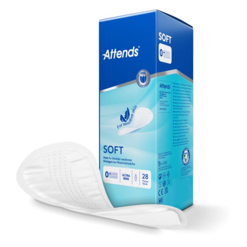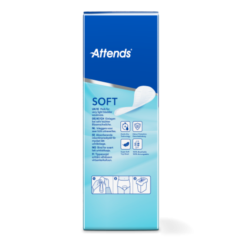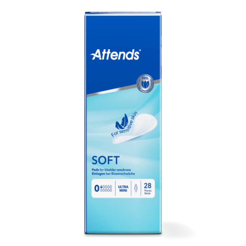 Attends Soft Ultra Mini (Saugstärke ) sind sehr dünne Slip-Einlagen mit einer geprägten Vliesoberfläche. Für tröpfchenweisen Urinabgang beim Niesen, Lachen, Husten z.B. durch geschwächte Beckenbodenmuskeln. Leistungsstarker Saugkern schließt Flüssigkeit sicher ein. Hautfreundlich und Luftdurchlässig. Praktisch und dezent: einfach mit Klebestreifen in der Unterwäsche zu befestigen. Nur 3 mm dick und unsichtbar unter der Kleidung. Attends Odour Protection verhindert die Entstehung von unangenehmen Gerüchen. Latexfrei.