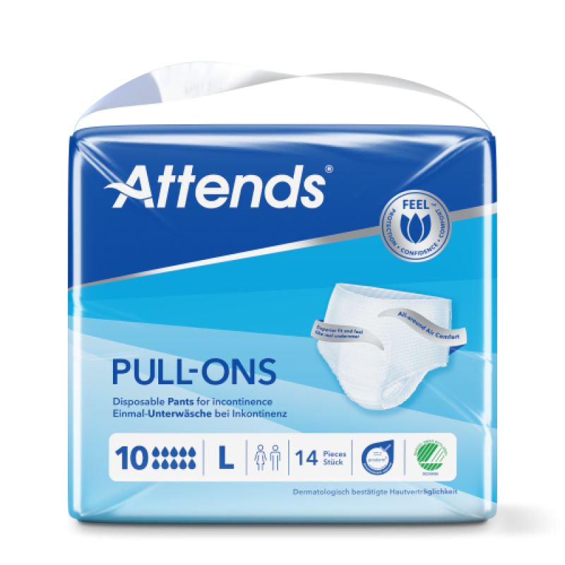 Attends Pull-Ons 10 sind weiche und diskrete Einmalhosen, die sich wie Unterwäsche anfühlen. Sie können ganz einfach an- und wieder ausgezogen werden und sind für starke Inkontinenz geeignet. Attends Pull-Ons bieten eine überlegene Passform für extra Tragekomfort. Ihr leistungsstarker Saugkern schützt vor Auslaufen und Geruch – für ein aktives Leben und ein sicheres Gefühl.