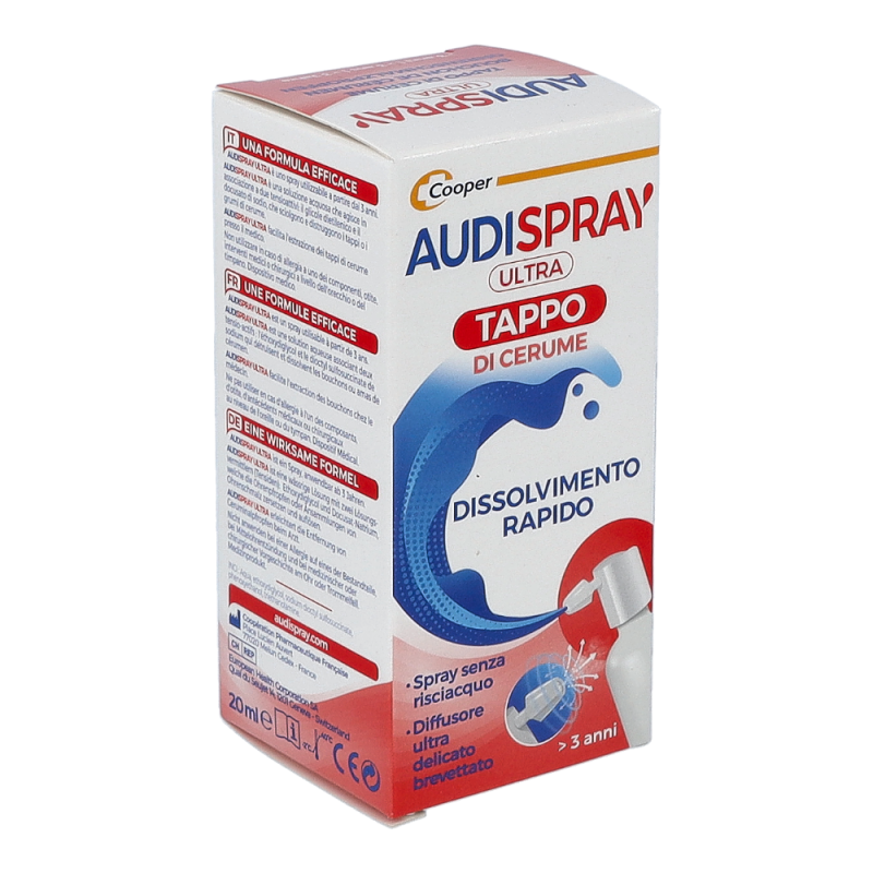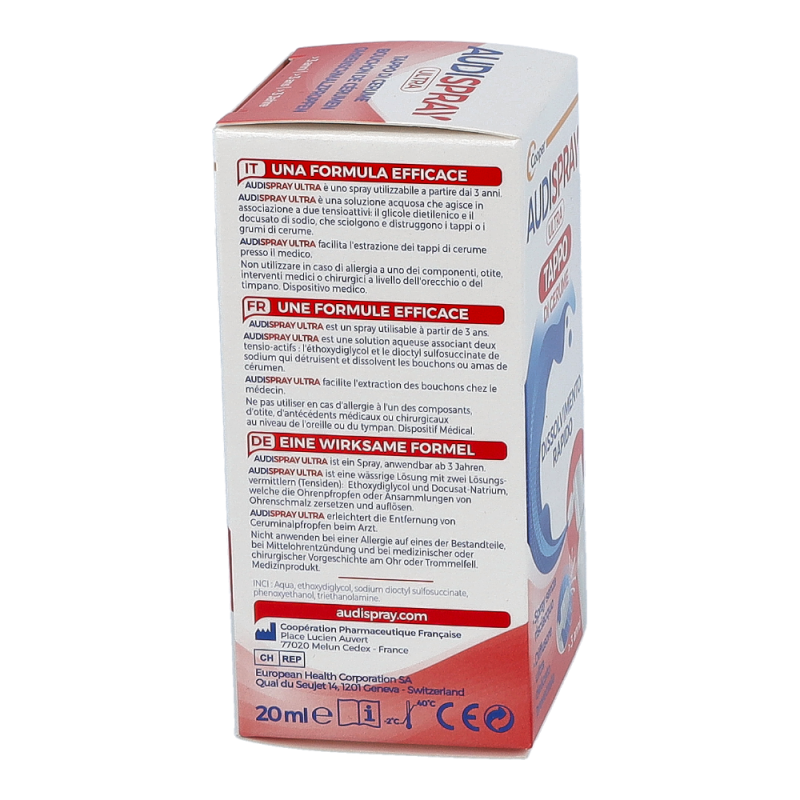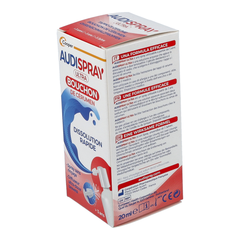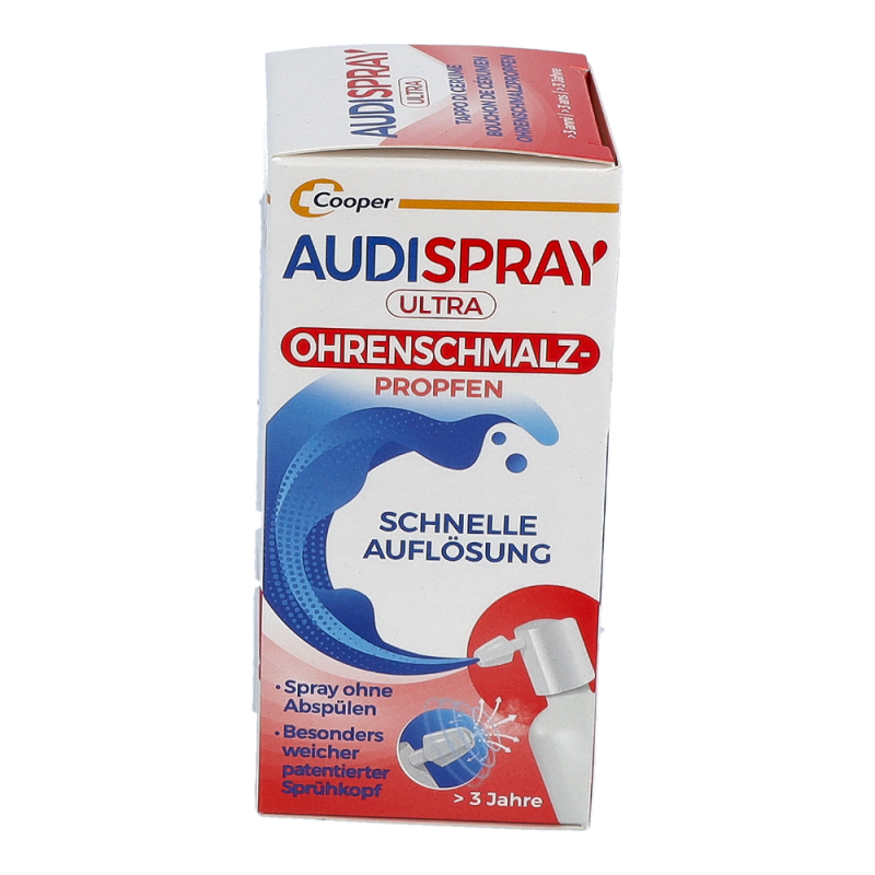 Audispray Ultra ist ein innovatives Produkt zur Behandlung zu Hause eines bereits vorhandenen oder sich bildenden Ohrenschmalzpfropfens. Die wässrige Lösung Audispray Ultra zersetzt zunächst den Ohrenschmalzpfropfen in mehrere Einzelteile und löst diese anschließend vollständig auf, so dass sie auf natürlichem Weg nach aussen, Richtung Ohrmuschel abtransportiert werden können.