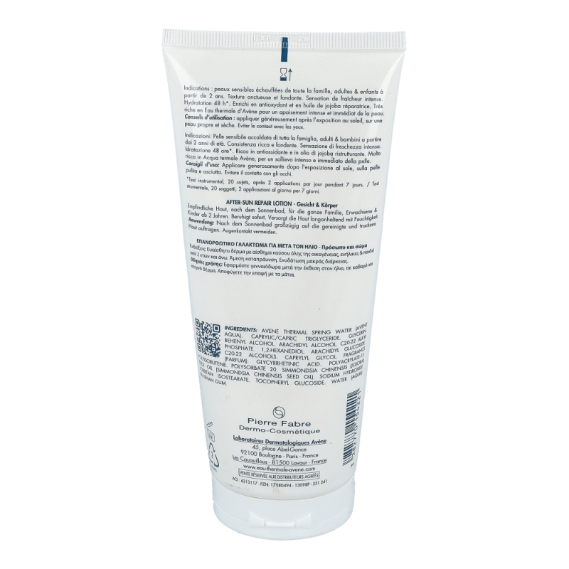 Reich an Avène Thermalwasser und angereichert mit Antioxidantien und regenerierendem Jojobaöl, beruhigt die After Sun Lotion sofort die empfindliche Haut, die nach dem Sonnenbad überhitzt ist. Ihre cremige, schmelzende Textur sorgt für ein angenehmes Gefühl von intensiver Frische. Sie spendet Gesicht und Körper bis zu 48 Stunden lang Feuchtigkeit* und verströmt einen zarten Duft. Sie ist geeignet für die ganze Familie, Erwachsene und Kinder, ab 2 Jahren. Die ökologisch gestaltete Flasche besteht zu 100 % aus recyceltem und wiederverwertbarem Kunststoff, um die Umwelt zu schonen.