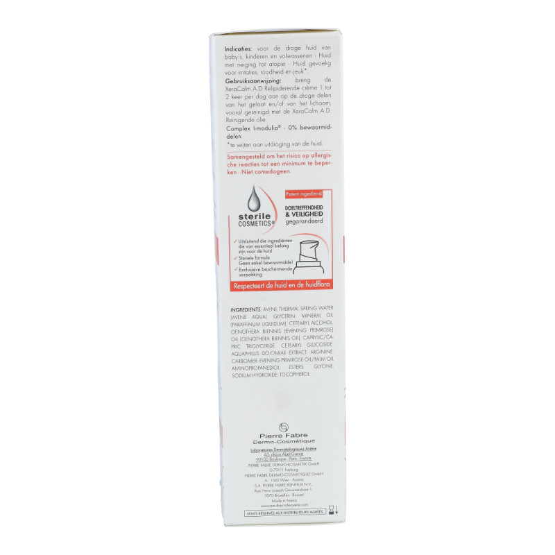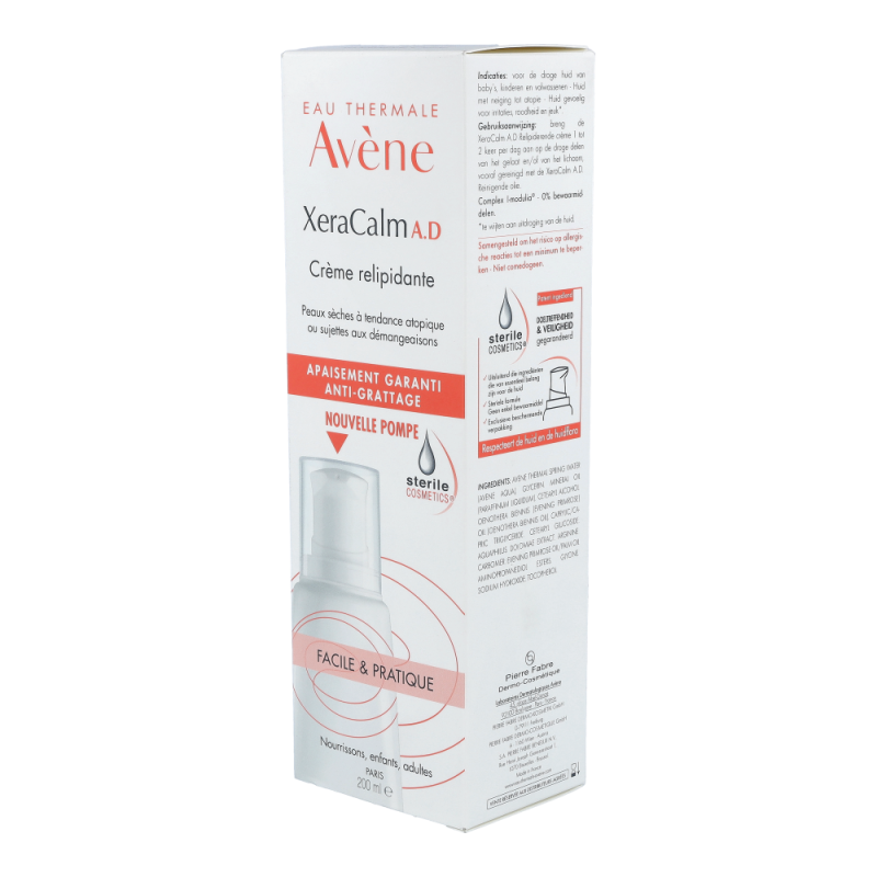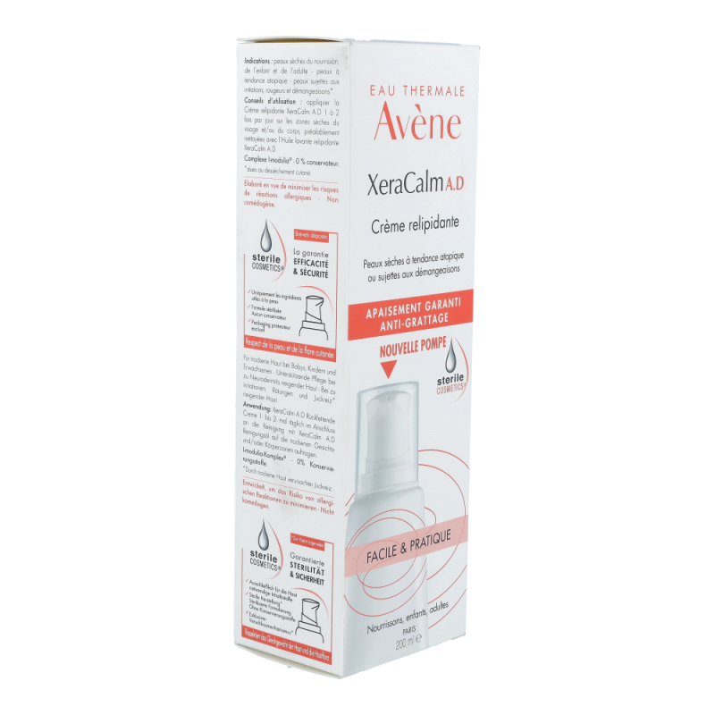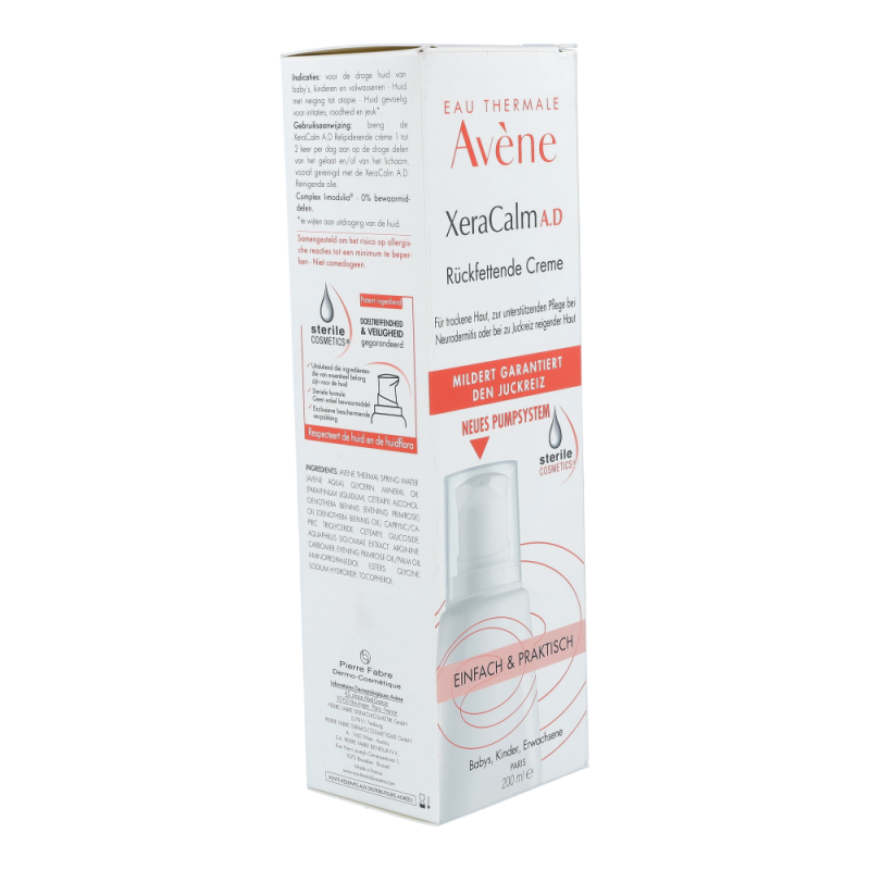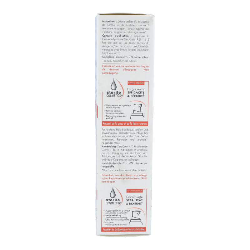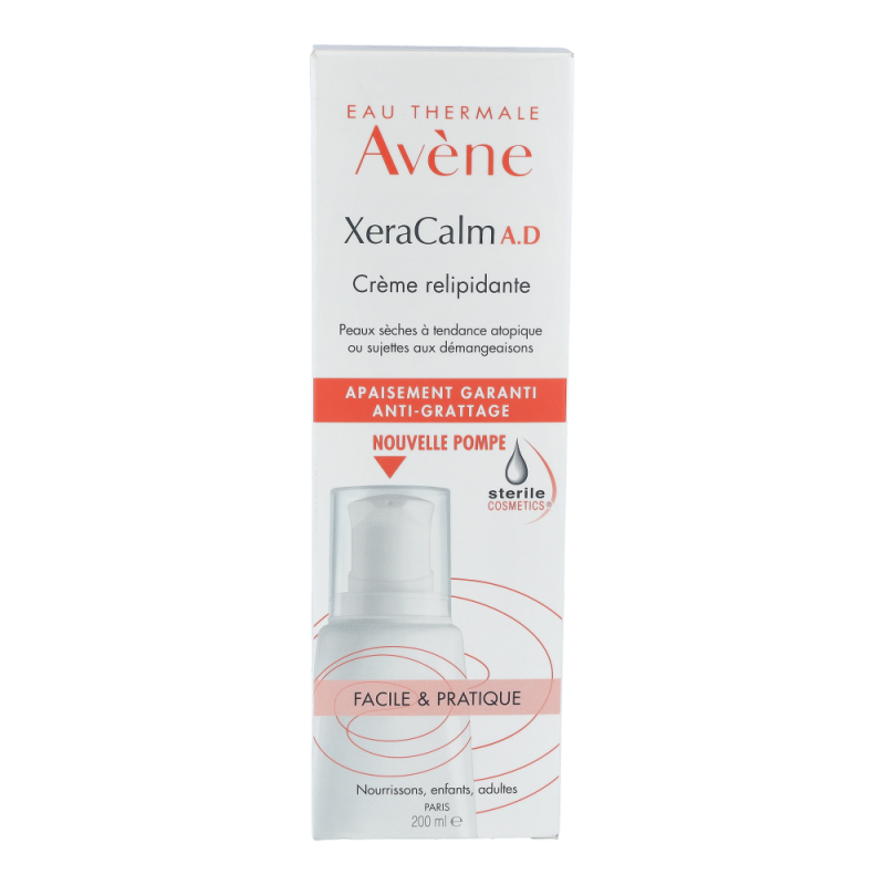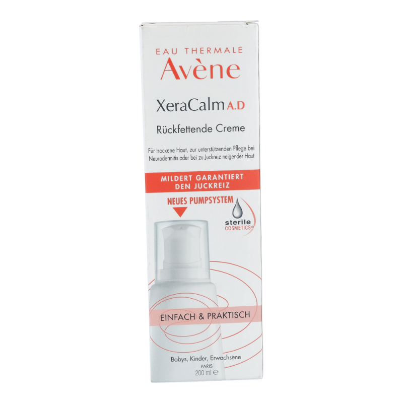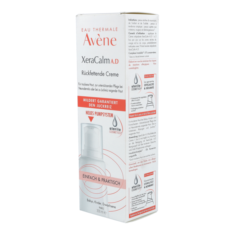 Die XeraCalm A.D Creme lindert den durch trockene Haut verursachten Juckreiz und respektiert das Mikrobiom der Haut dank der Kombination aus I-modulia®, dem ersten post-biotischen Aktivstoff aus dem Avène Thermalwasser, der Juckreiz* reduziert, die Abwehrkräfte der Haut stimuliert und Irritationen bekämpft, mit Cer-omega, hautähnlichen Lipiden, die gegen die Trockenheit wirken und die Hautbarriere wiederherstellen, und Avène Thermalwasser (beruhigend, reizlindernd und pflegend). Diese Pflege ist perfekt für sehr trockene, juckende, zu Neurodermitis neigende Haut bei Babys, Kindern und Erwachsenen geeignet. Sie ist nicht komedogen und frei von Duftstoffen. Die XeraCalm A.D Creme wurde entwickelt, um das Risiko allergischer Reaktionen zu minimieren und enthält nur Inhaltsstoffe, die der Haut gut tun.Dank Sterile Cosmetics®, einer einzigartigen Technologie, die das Produkt während der gesamten Anwendung steril hält, und dem hermetischen Pumpverschluss ist das Produkt sicher und optimal verträglich für die Haut und das Mikrobiom der Haut.