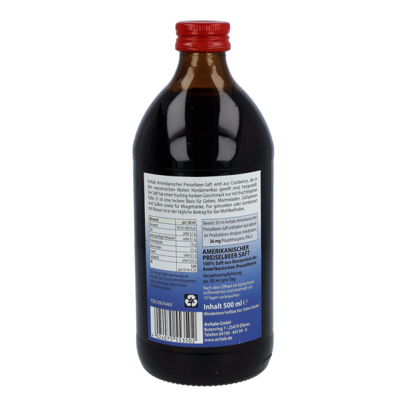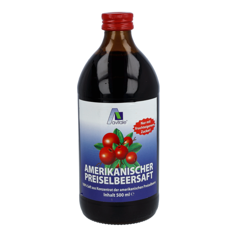 Avitale Preiselbeere Amerikanisch Saft 100% wird aus Preiselbeeren, die in den wasserreichen Weiten Nordamerikas gereift sind, hergestellt. Der Saft hat einen fruchtig-herben Geschmack mit ausschließlich fruchteigener Süße. Eine leckere Basis für Gelees, Marmeladen, Süßspeisen und Soßen sowie für Mixgetränke. Pur getrunken oder kombiniert mit Wasser ist er der tägliche Beitrag für das Wohlbefinden.