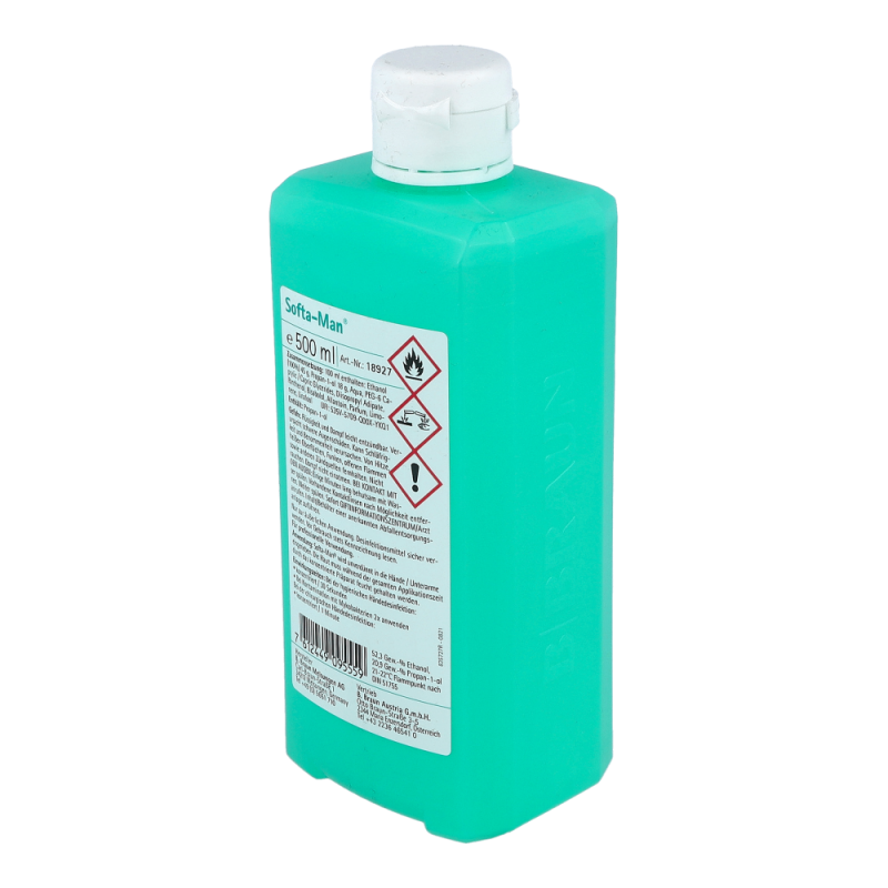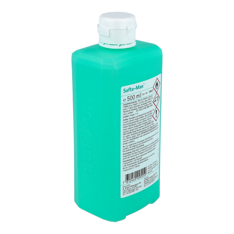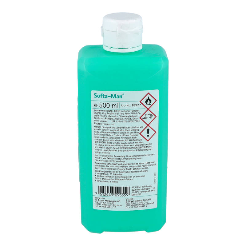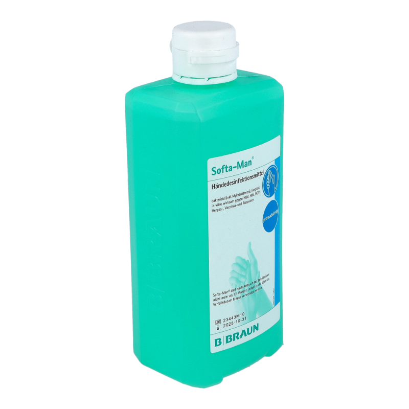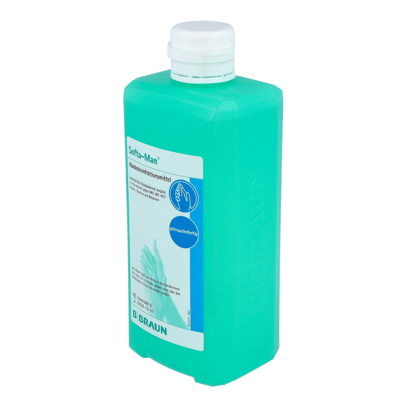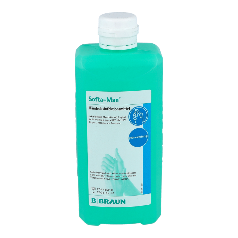 B. Braun Softa-Man Händedesinfektion ist ein alkoholisches Händedesinfektionsmittel für trockene bis normale Haut. Das Mittel wirkt gegen Bakterien und Pilze und zeigt eine sichere Sofort- und Langzeitwirkung. Die Desinfektion ist dermatologisch getestet und weist eine sehr gute Hautverträglichkeit auf.
