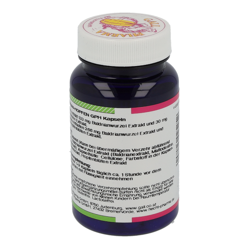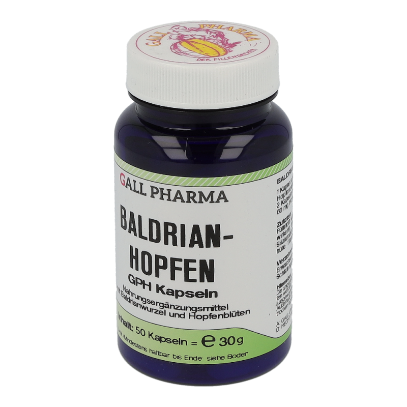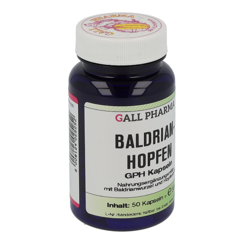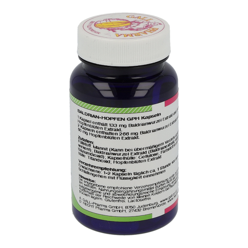 Baldrian-Hopfen GPH Kapseln sind ein Nahrungsergänzungsmittel mit einer Kombination aus Baldrianwurzel Trockenextrakt und Hopfenzapfen Trockenextrakt. Dieses kann bei nervös bedingten Einschlafstörungen und Unruhezuständen eingesetzt werden. Der physiologische Schlafrhythmus soll unbeeinflusst bleiben. Die Kombination der pflanzlichen Extrakte führt zu keiner Abhängigkeit, bietet eine optimale Alternative zu anderen schlaffördernden Mitteln und kann bedenkenlos eingenommen werden.
