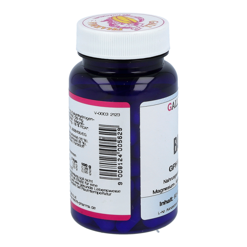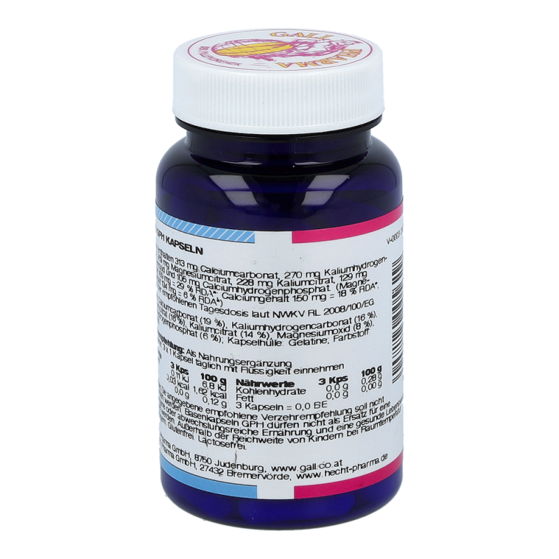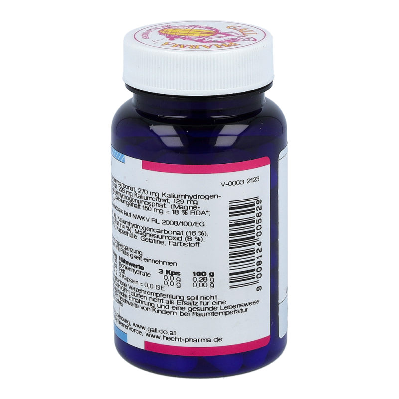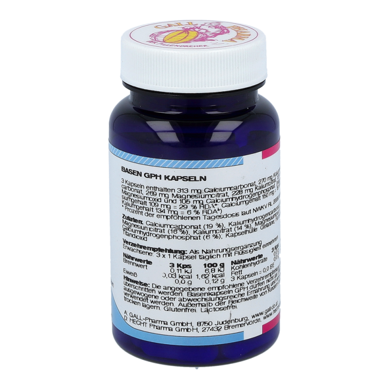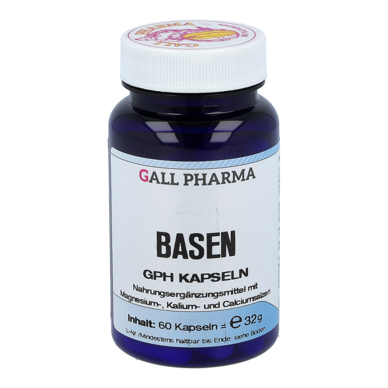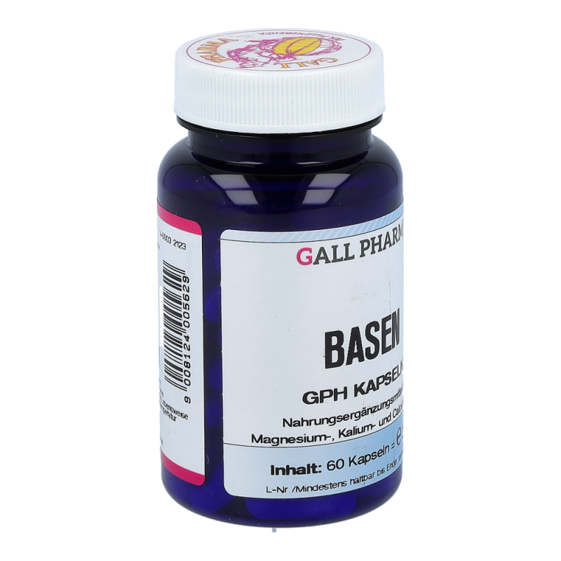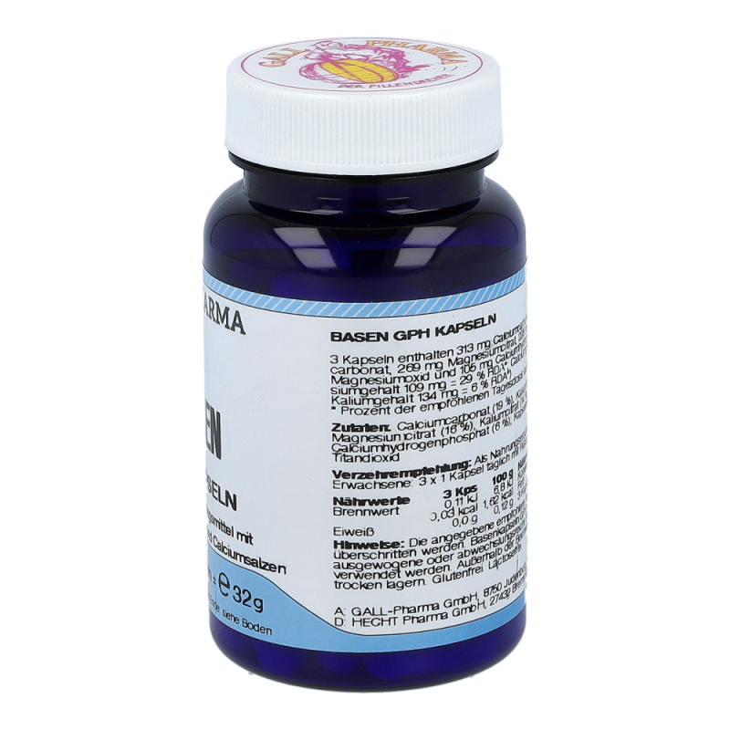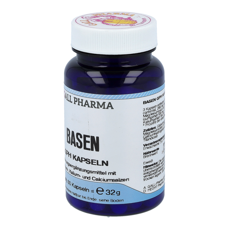 Gall Pharma Basen Kapseln enthalten 36,5 mg Magnesium in Form von Magnesiumoxid und Magnesiumcitrat, 45 mg Kalium in Form von Kaliumhydrogencarbonat und Kaliumcitrat und 50 mg Calcium in Form von Calciumcarbonat und Calciumhydrogenphosphat in einer Hartgelatinekapsel.