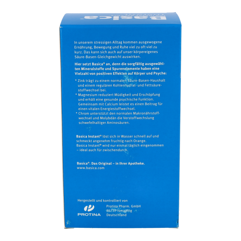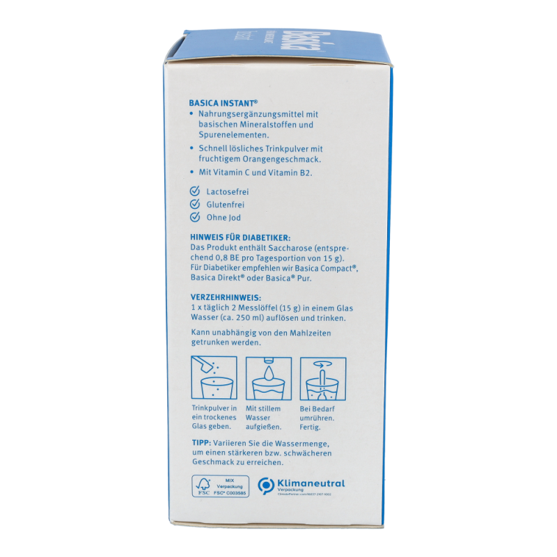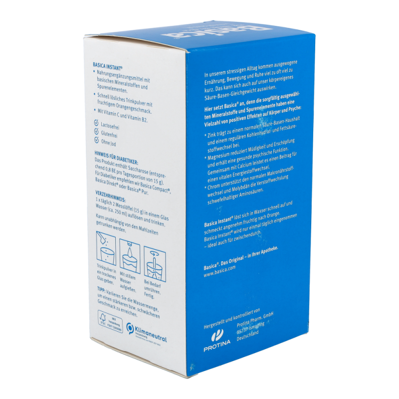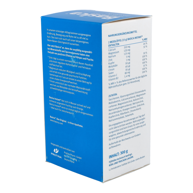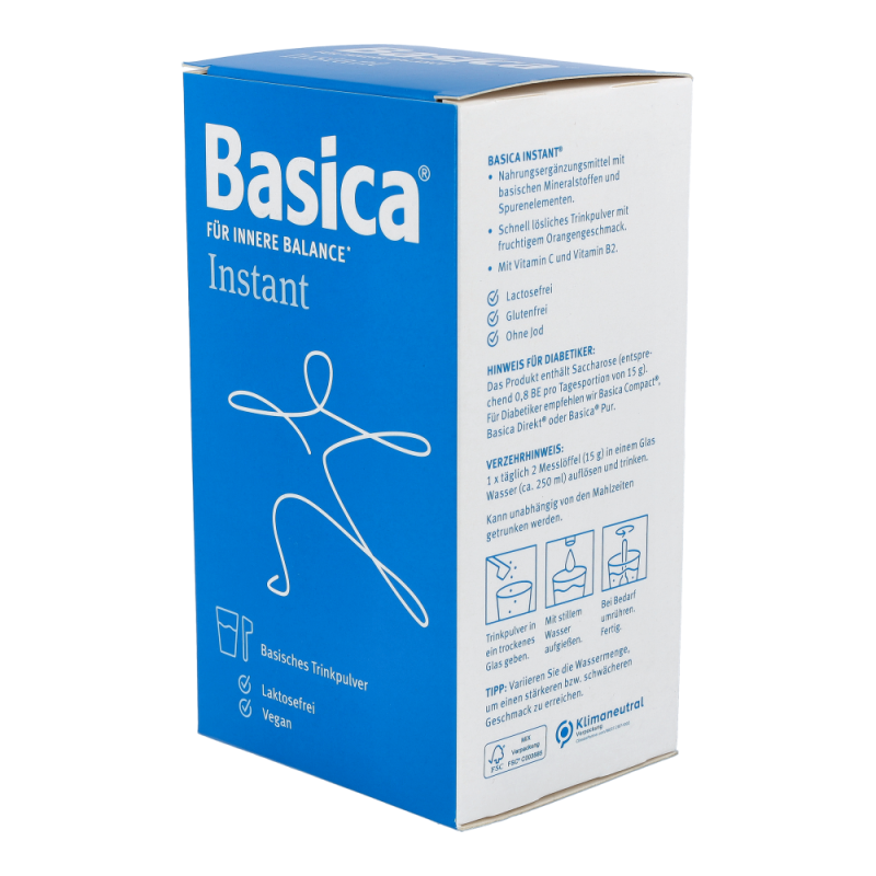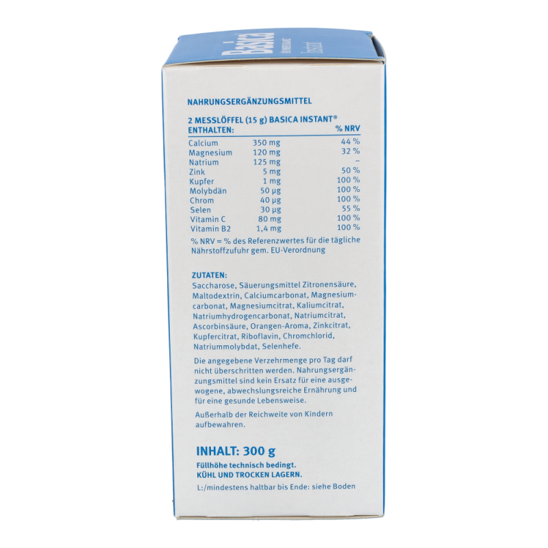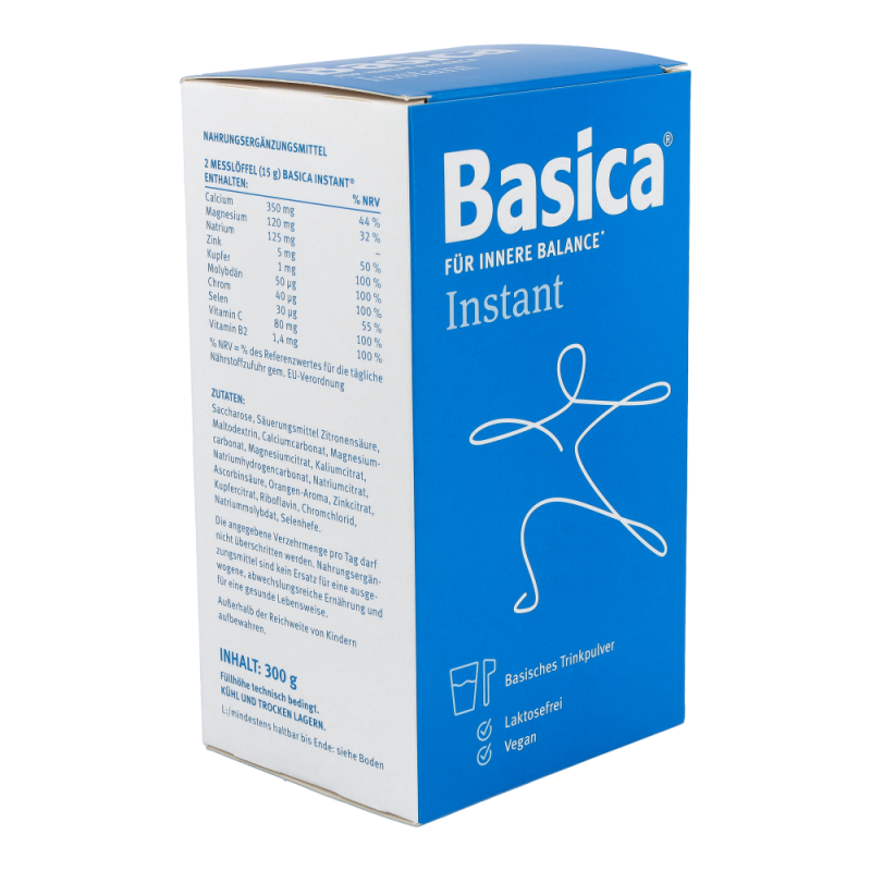 Basica Instant mit seinem fruchtig-frischen Geschmack liefert einmal täglich eine ausgewogene Kombination basischer Vitalstoffe und Spurenelemente für den Ausgleich Ihres Säure-Basen-Haushaltes. Zusätzlich enthält das Pulver die Vitamine C und B2.