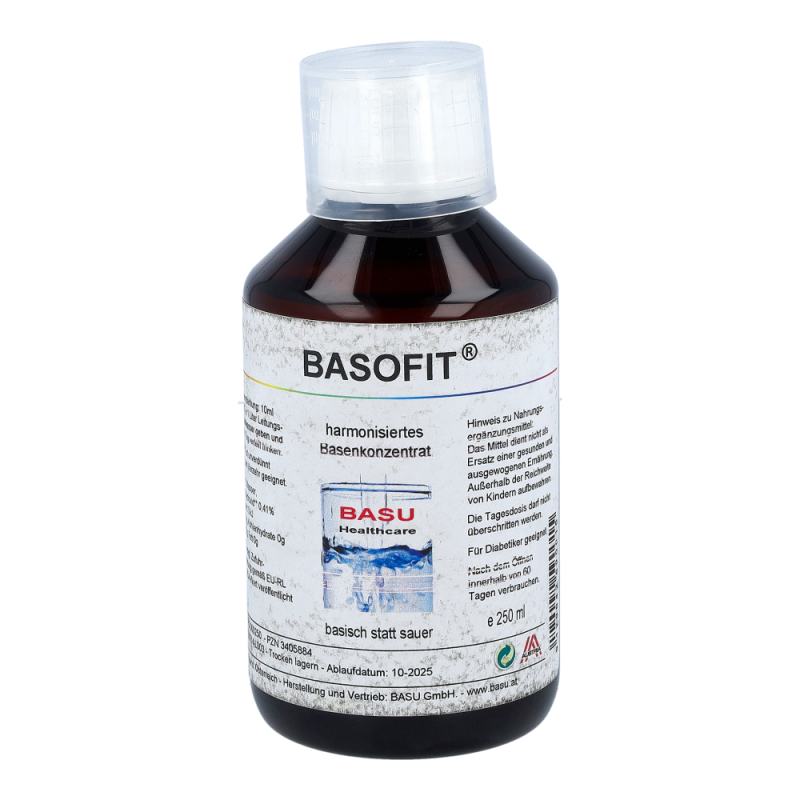 Basofit Basen Konzentrat Ph 13,0 wird mittels eines spezielles Verfahren „wasserstoffarm“ gemacht und mit Biophotonen angereichert. Ein hoher basischer pH-Wert sowie negativ geladene OH-Ionen zeichnen das Mittel aus. Die Vielzahl der enthaltenen positiv geladenen Ionen wirken positiv auf den Organismus.