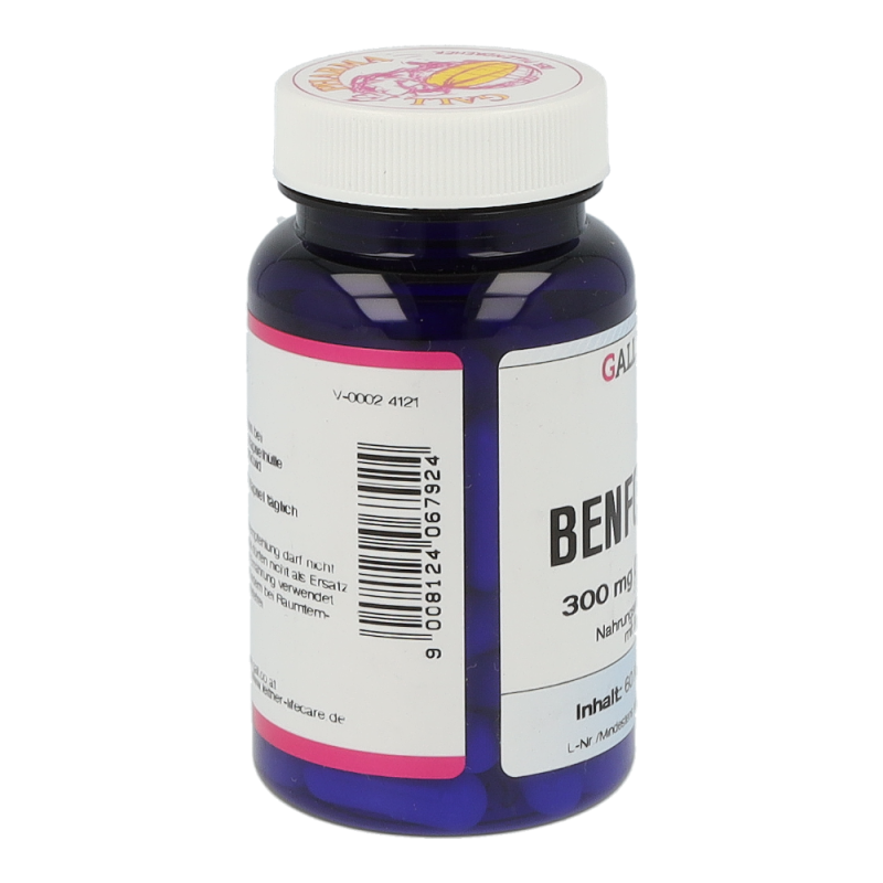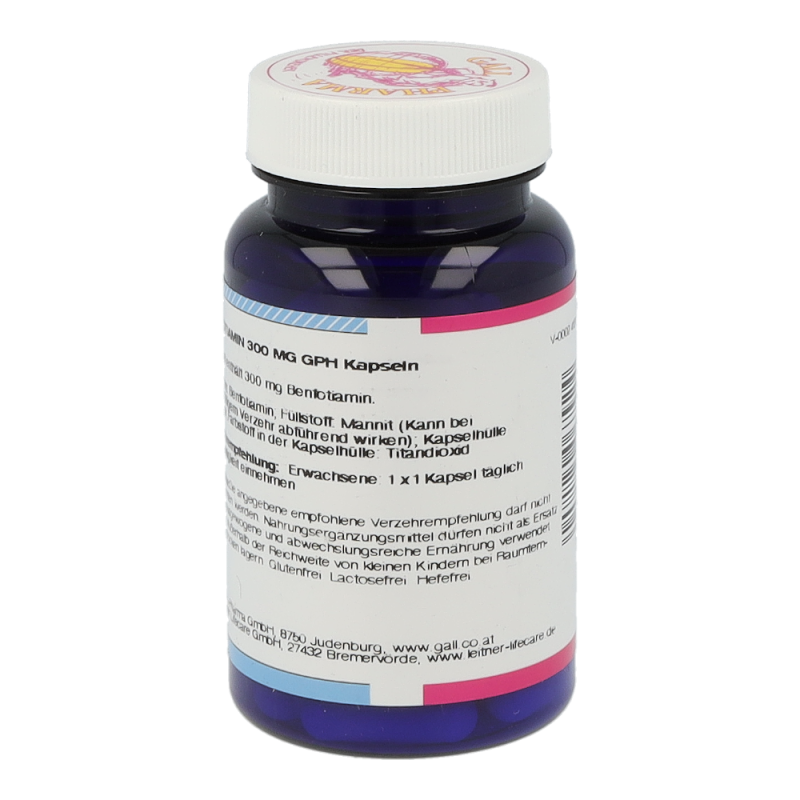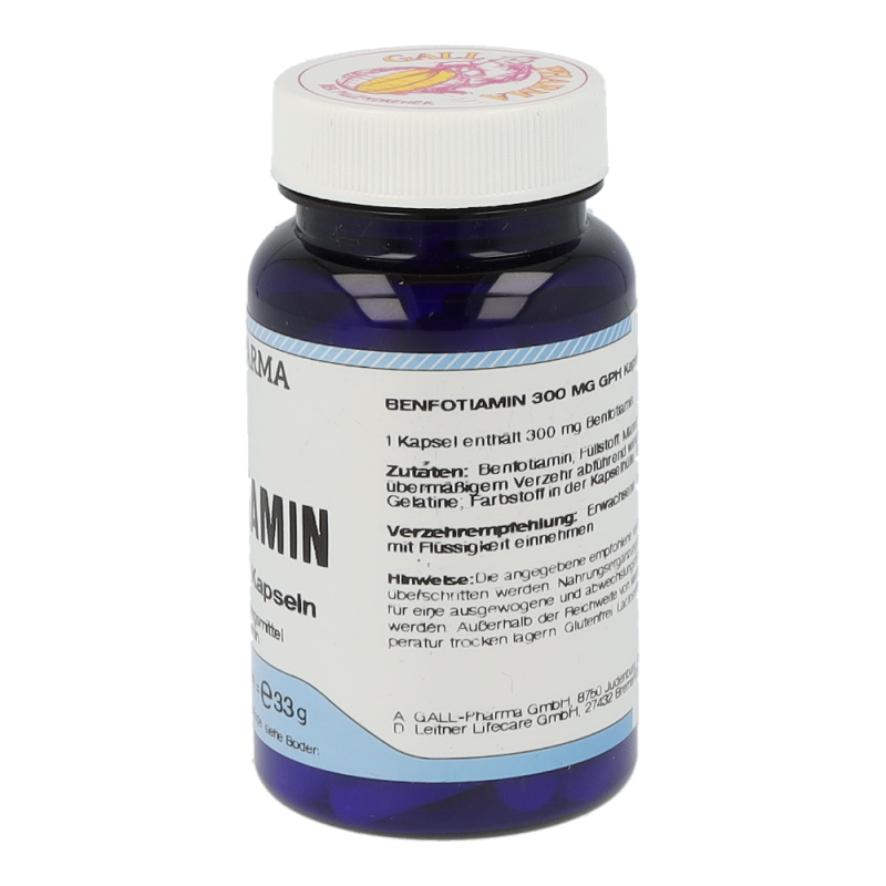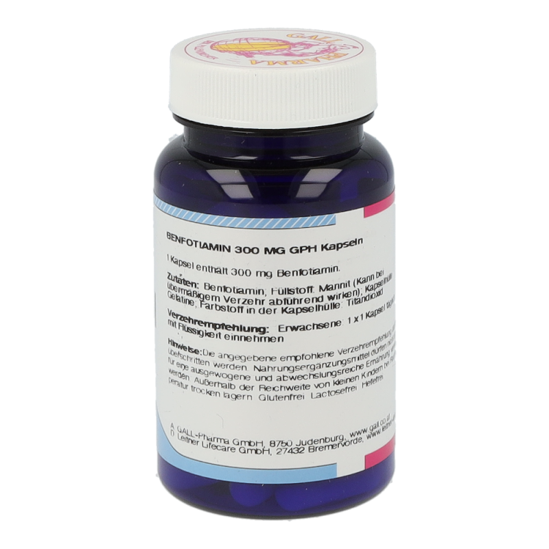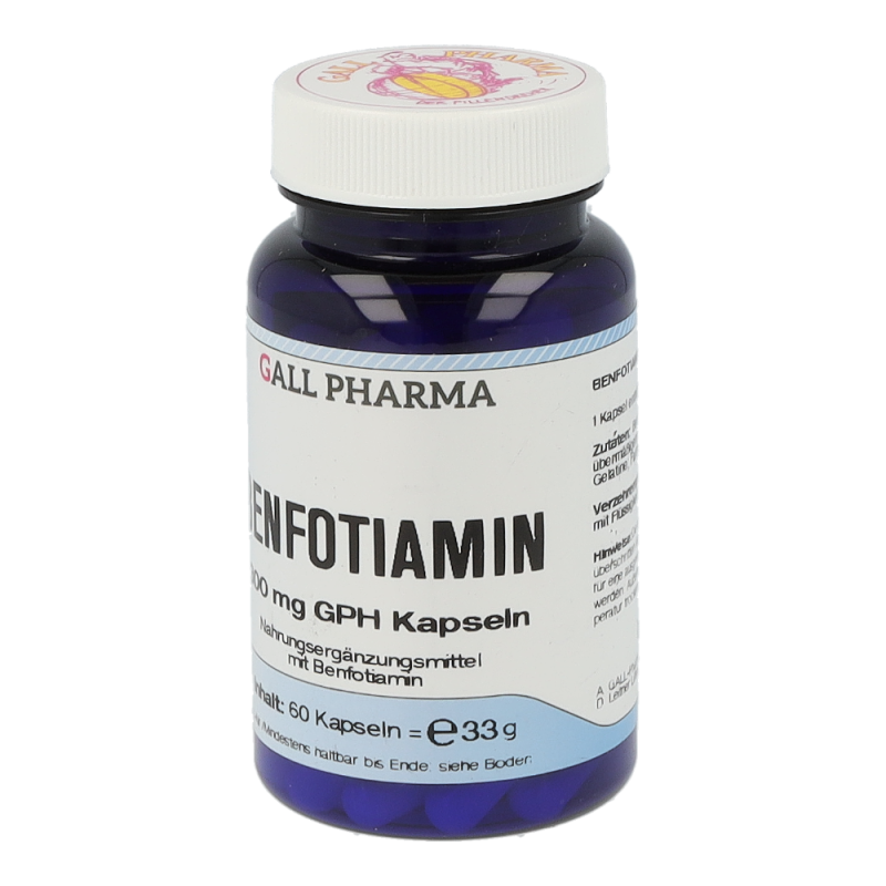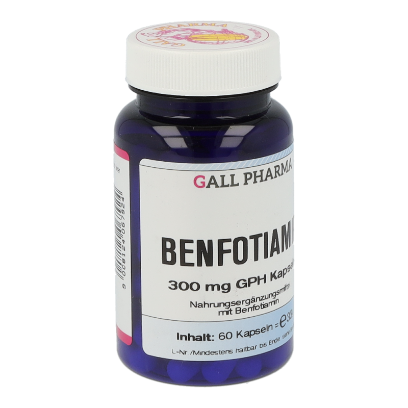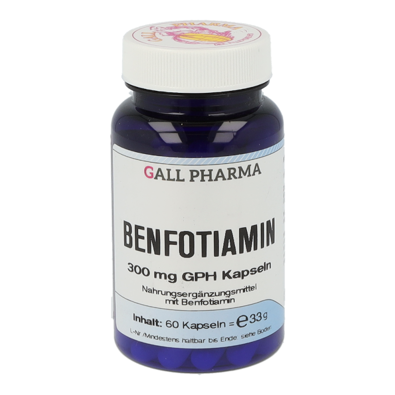 Benfotiamin ist die Vorstufe von Vitamin B1. Das fettlös-liche Benfotiamin zeichnet sich durch eine deutlich bes-sere  Bioverfügbarkeit  gegenüber  dem  wasserlöslichen  Thiamin  aus  (etwa  5-  bis  7-Mal  höher  im  Vergleich  zu  Vitamin  B1).  Im  Körper  wird  Benfotiamin  zu  Vitamin  B1  umgewandelt. Durch die effektivere Aufnahme kann ein Vitamin  B1  Mangel  durch  Benfotiamin  rascher  ausgegli-chen  werden.  Vitamin  B1  hat  im  menschlichen  Organis-mus zahlreiche Funktionen: Beispielsweise trägt Thiamin zu einem normalen Energiestoffwechsel bei und hat eine große Bedeutung bei der Energiegewinnung aus Kohlen-hydraten und Eiweißen. Außerdem trägt Thiamin zu einer normalen  Funktion  des  Nervensystems  bei,  da  es  als  Phosphatspender  an  der  Reizweiterleitung  beteiligt  ist.  Zu  guter  Letzt  trägt  Thiamin  zu  einer  normalen  psychi-schen Funktion und zu einer normalen Funktion des Her-zens bei. Da der menschliche Organismus Vitamin B1 nur in  geringen  Mengen  speichern  kann,  ist  eine  regelmäßi-ge Zufuhr notwendig. Benfotiamin 300 mg GPH Kapseln enthalten 300 mg Benfotiamin. Als Ausgangsstoff für die Produktion wird Vitamin B1 verwendet.