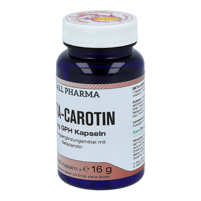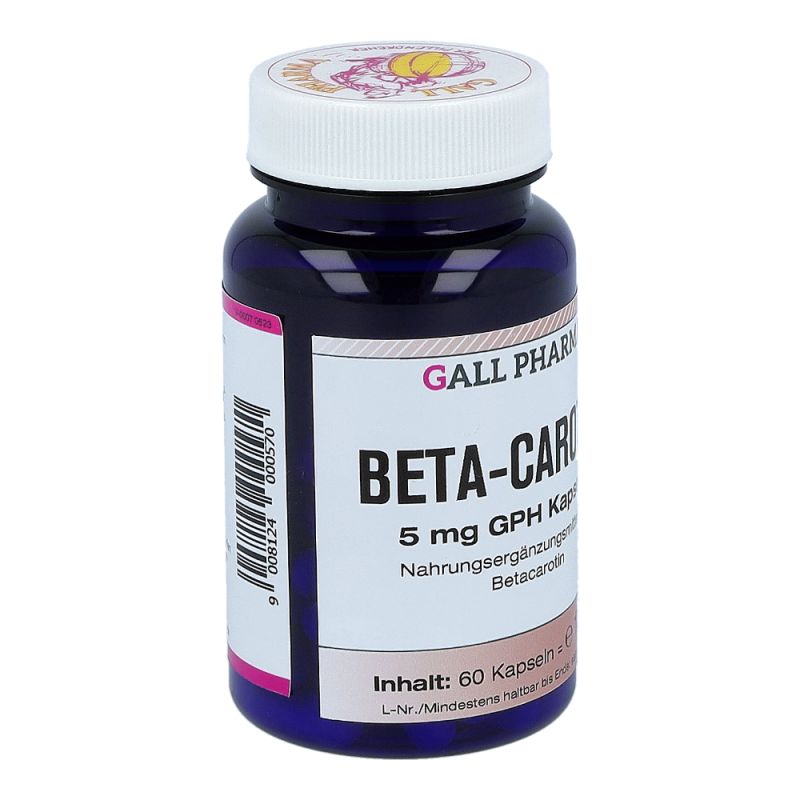 Gall Pharma Beta Carotin 5 mg Kapseln enthalten 5 mg Beta-Carotin in einer Hartgelatinekapsel. Vitamin A trägt zu einem normalen Eisenstoffwechsel und zur Erhaltung normaler Schleimhäute bei. Außerdem dient es zur Erhaltung normaler Haut und Sehkraft und stärkt die Funktion des Immunsystems. Zudem hat es eine Funktion bei der Zellspezialisierung.