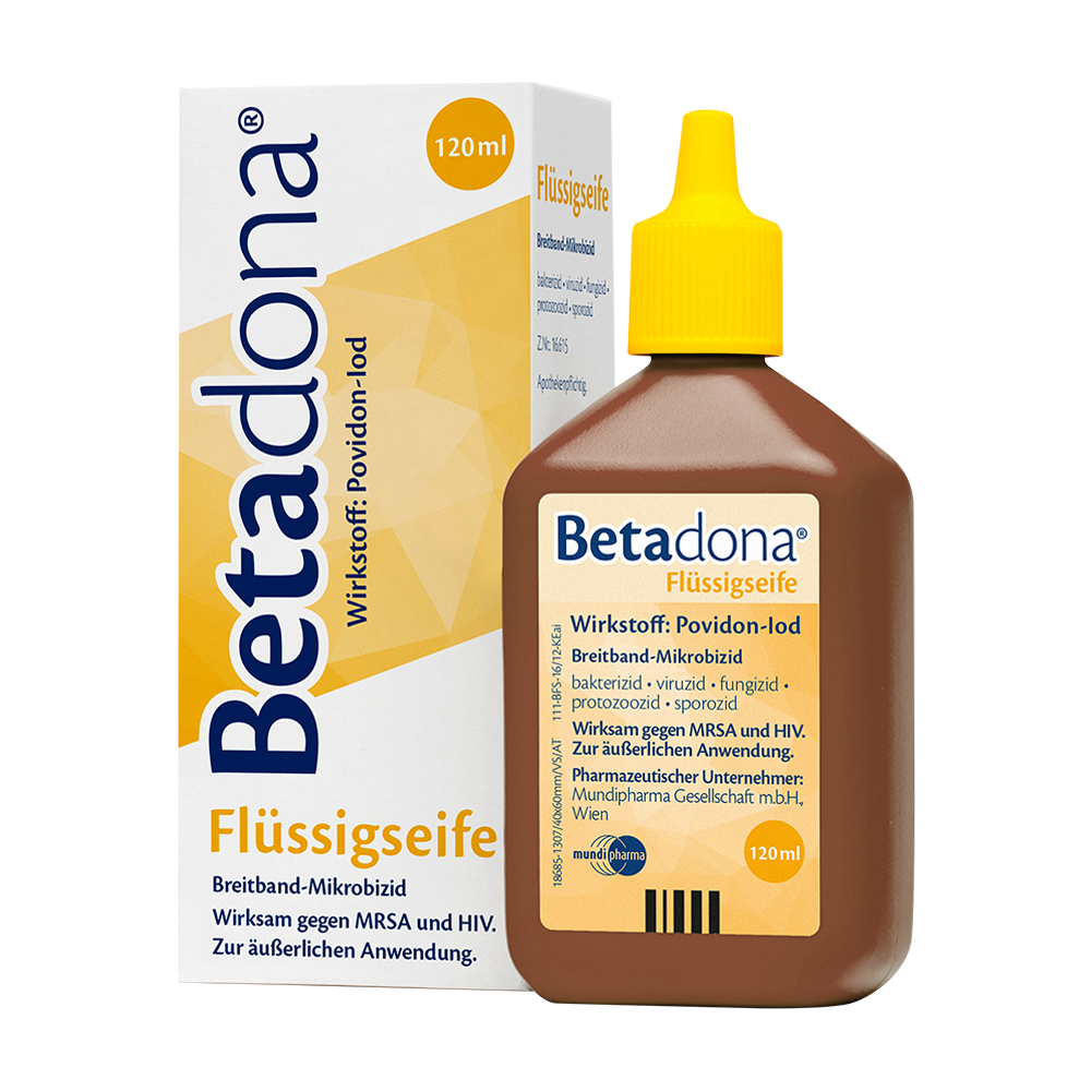Betadona® Flüssigseife zur hygienischen Händedesinfektion und antiseptischen Waschung. Sie wirkt keimtötend gegen Bakterien, Pilze, Sporen, Viren und Protozoen. Dabei pflegt sie die Haut rückfettend..