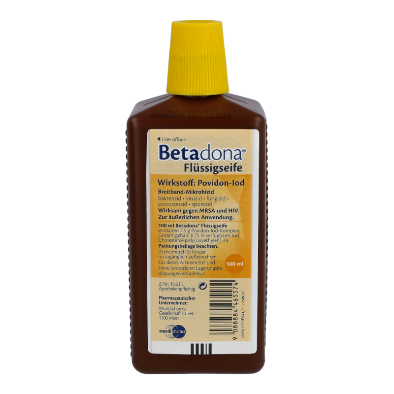 Betadona® Flüssigseife zur hygienischen Händedesinfektion und antiseptischen Waschung. Sie wirkt keimtötend gegen Bakterien, Pilze, Sporen, Viren und Protozoen. Dabei pflegt sie die Haut rückfettend..