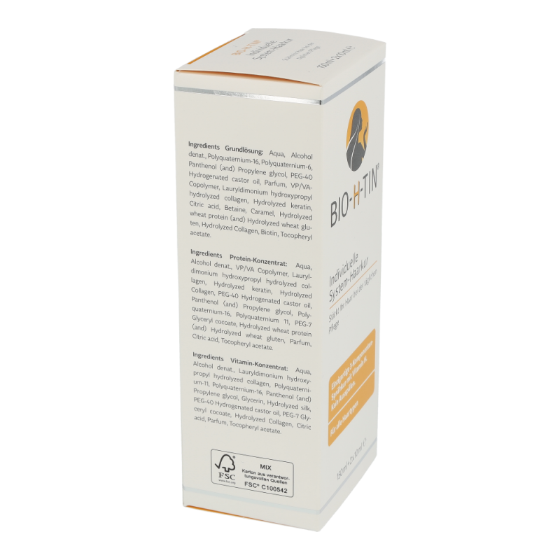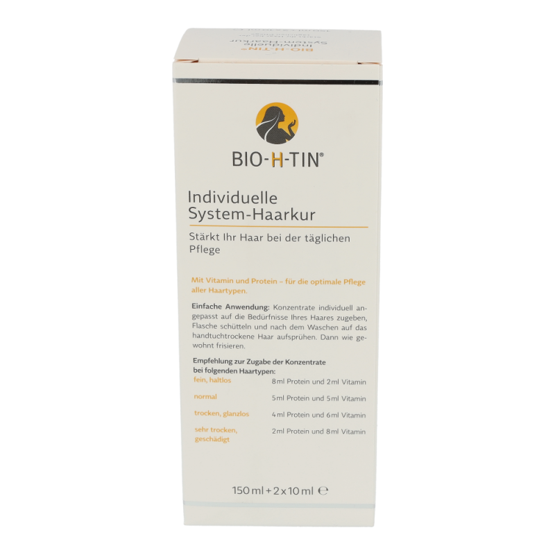 Bio-h-tin System Haarkur spendet dem Haar genau die Pflegestoffe, die es braucht, um attraktiv und gesund zu wirken. Dazu ist sie nach einem Baukastenprinzip mit 3 Komponenten aufgebaut: Grundlösung, Protein-Konzentrat und Vitamin-Konzentrat. Proteine verleihen dem Haar mehr Stand und Festigkeit, damit Ihre Frisur perfekt sitzt. Vitamine sorgen für schönen Glanz und verbessern die Kämmbarkeit.