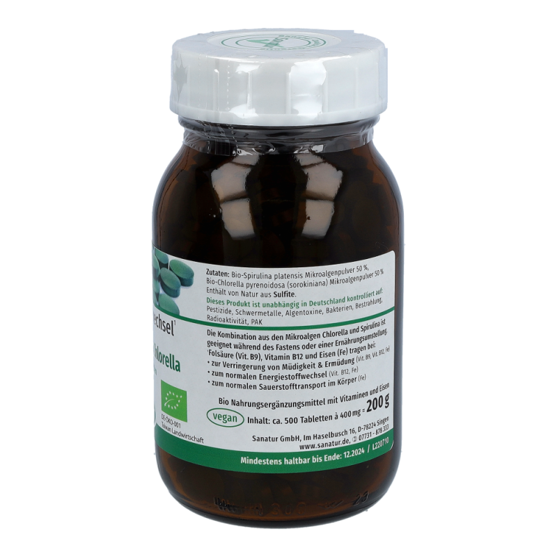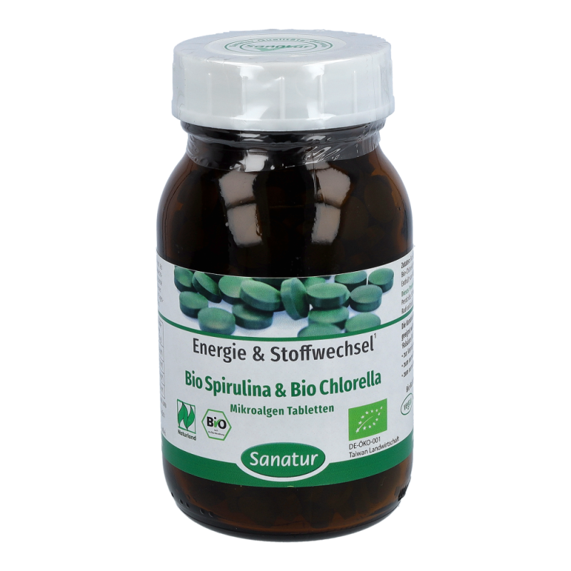 "BioSpirulina- und BioChlorella-Algen im Verhältnis 1 : 1 kombiniert, vereint die spezifischen Eigenschaften beider Mikroalgen in idealer Weise. Die Zellwände der Chlorella wurden schonend aufgeschlossen, mit Erhalt der wertvollen Zellulose. Zur natürlichen Nahrungsergänzung begleitend während des Fastens oder einer Ernährungsumstellung empfohlen. Sanatur BioSpirulina & BioChlorella enthält Vitamin A (aus Provitamin A), Vitamin B12, Vitamin K und Eisen. Diese Stoffe tragen bei: zu einer normalen Funktion des Immunsystems (Vit. A, Vit. B12, Eisen) zur Verringerung von Müdigkeit und Ermüdung (Vit. B12, Eisen) zur normalen Bildung von roten Blutkörperchen (Vit. B12, Eisen) zu einer normalen Funktion des Nervensystems (Vit. B12) zu einer normalen Blutgerinnung (Vit. K) zu einem normalen Enrgiestoffwechsel (Vit. A, Vit. B12, Eisen) Das Besondere an Sanatur BioSpirulina & BioChlorella: nur im reinen Sonnenlicht ohne künstliche Lichtquellen kultiviert ohne jegliche Presshilfs-, Farb- und Konservierungsstoffe verarbeitet und gepresst von Natur aus ohne Hefe, Gluten, Laktose und Jod 100 % pflanzlich, vegan"