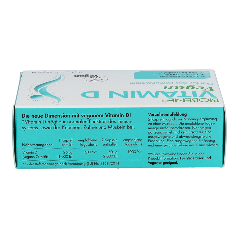 BIOBENE® VITAMIN D Vegan ist ein wertvolles Nahrungsergänzungsmittel welches zur Funktionserhaltung des Immunsystems, der Knochen, der Zähne und der Muskeln beiträgt.Forschungsergebnisse der letzten Jahre haben nunmehr den Zusammenhang zwischen der Vitamin D Versorgung und der Funktion des Immunsystems gezeigt und liefern Hinweise auf eine Rolle des Vitamin D für viele wesentliche Stoffwechselvorgänge zur Gewährleistung einer normalen Immunabwehr. Insbesondere im Winter kommt die körpereigene Vitamin D-Synthese nahezu vollständig zum Erliegen. Vitamin D-Mangel stellt in Europa ein echtes Problem dar, denn bei 50 – 70 % der Bevölkerung ist der Vitamin D-Blutspiegel erniedrigt, da die UV-B Strahlung auf der nördlichen Hemisphäre von Oktober bis März erniedrigt ist..