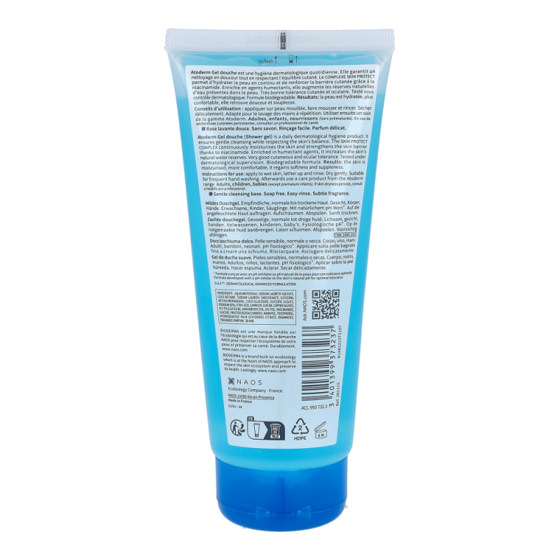 Bioderma Atoderm Duschgel 200 ml ist für empfindliche, trockene Haut. Das cremig schäumende Duschgel spendet Feuchtigkeit und unterstützt die Barrierefunktion der Haut. Der natürliche Haut-pH-Wert bleibt erhalten. Für Gesicht und Körper. Für Säuglinge geeignet. Seifenfrei, hypoallergen. Ohne Farbstoffe, ohne Parabene.