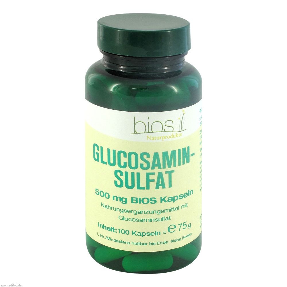 Bios Glucosaminsulfat 500 mg Kapseln enthalten 500 mg Glucosaminsulfat in Form des Kaliumsalzes in einer Hartgelatinekapsel. Glucosaminsulfat-Kaliumsalz wird aus Krabbenschalen gewonnen.