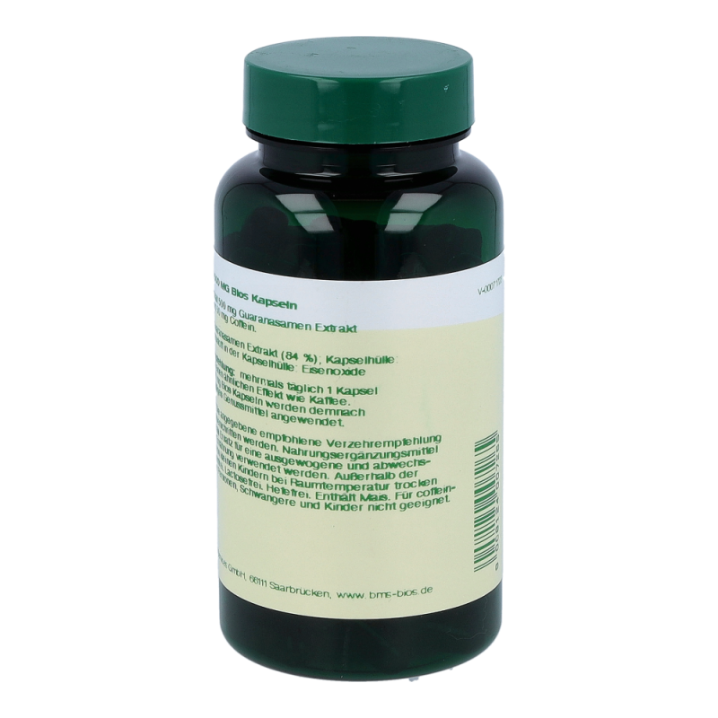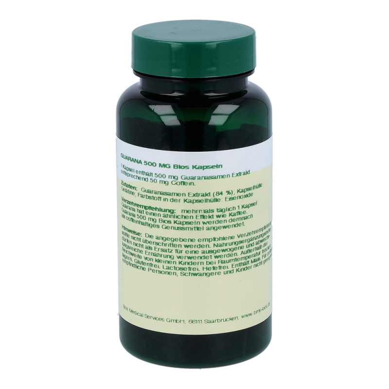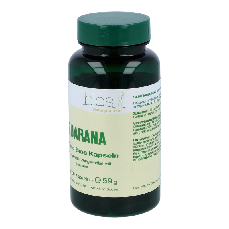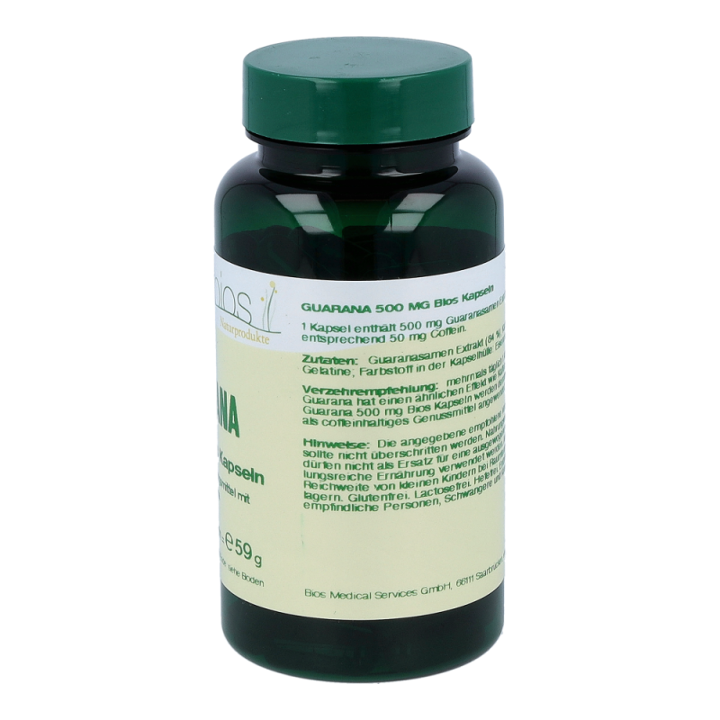Bios Guarana 500 mg Kapseln enthalten 500 mg Guarana Extrakt in einer Hartgelatinekapsel. Die Stammpflanze der Guaranapflanze, ein Kletterstrauch, rankt an großen Bäumen des Amazonas Regenwaldes empor. Die etwa haselnussgroßen Früchte enthalten einen Samen. Dieser wird vermahlen und liefert das Guaranapulver. Das Naturprodukt ist reich an Coffein.