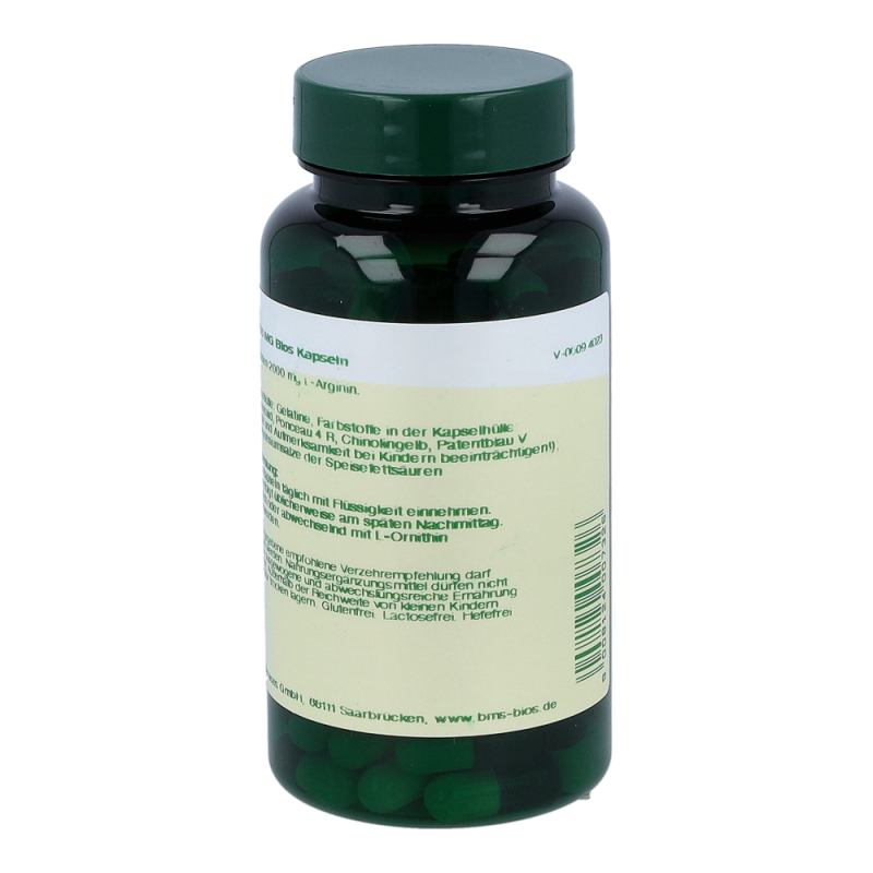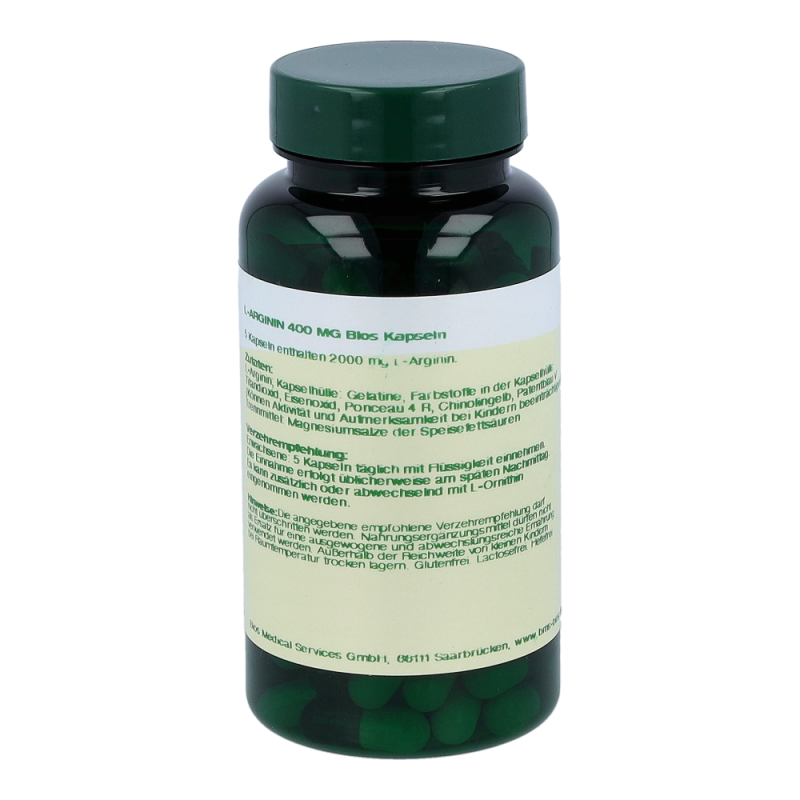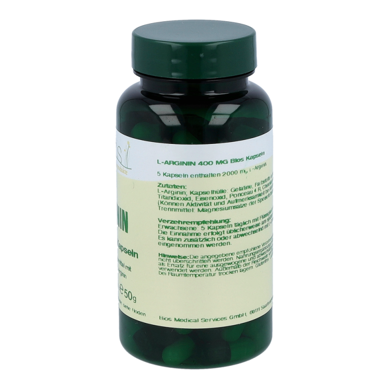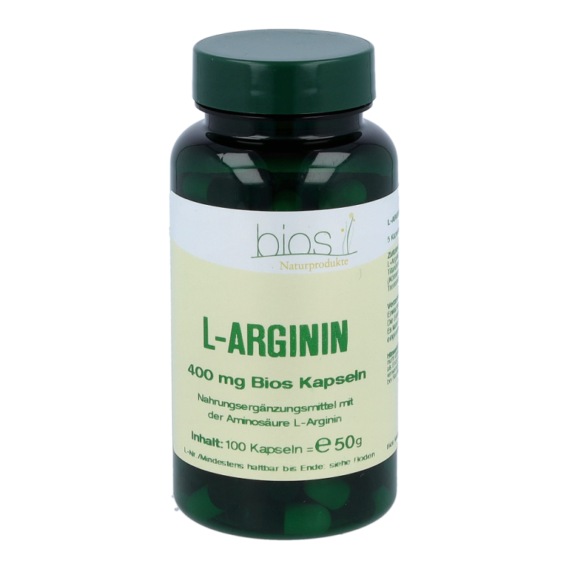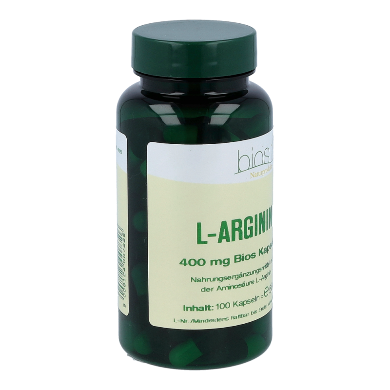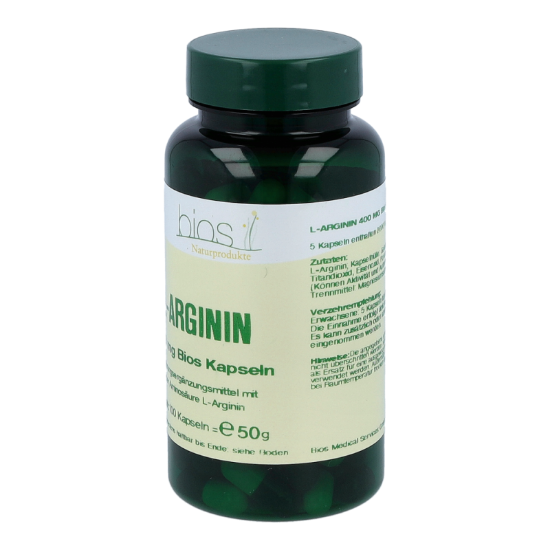 Bios L-Arginin 400 mg Kapseln enthalten 400 mg L-Arginin in einer Hartgelatinekapsel. L-Arginin gehört zu den semi-essentiellen Aminosäuren und kommt vor allem in Nahrungsmitteln mit hohem Eiweißanteil vor.