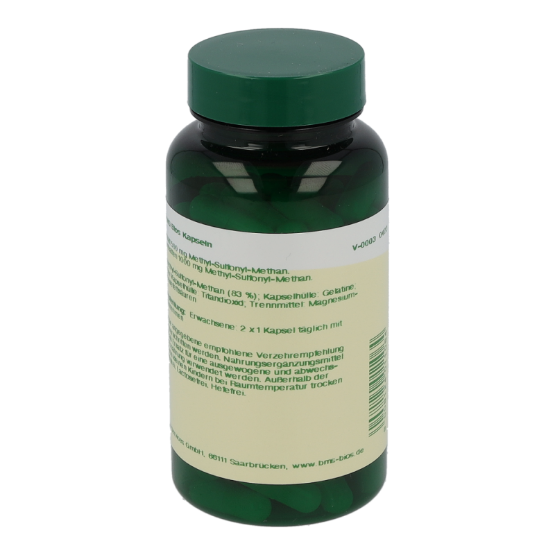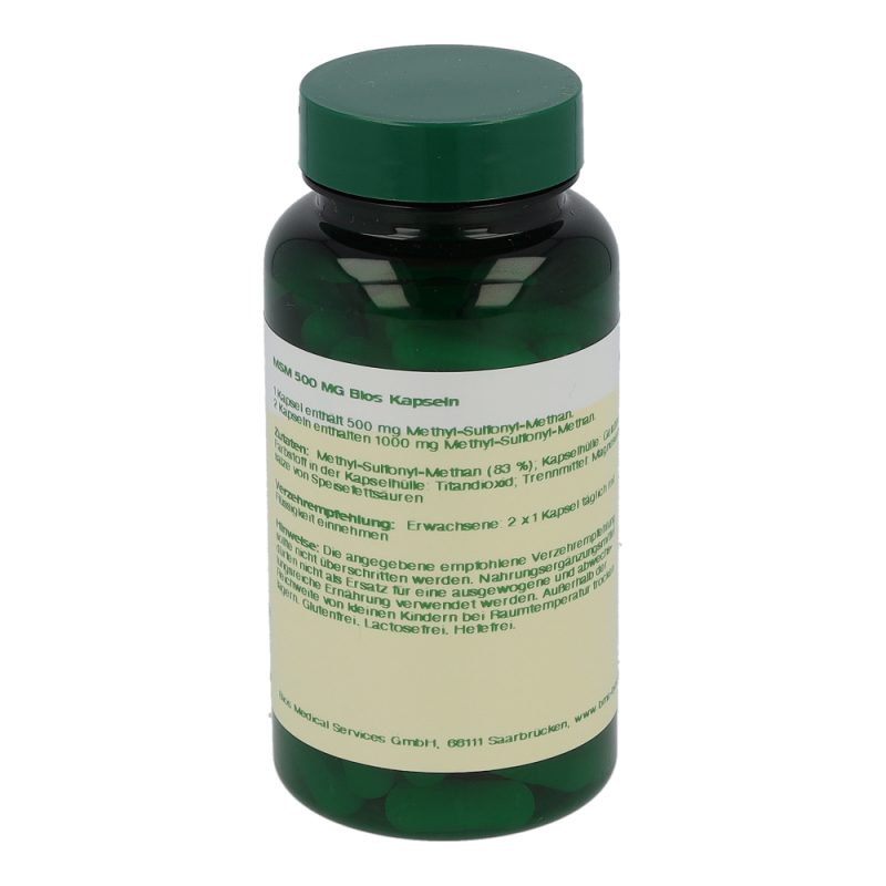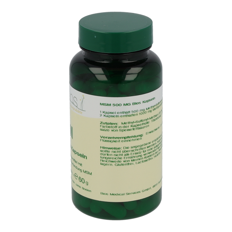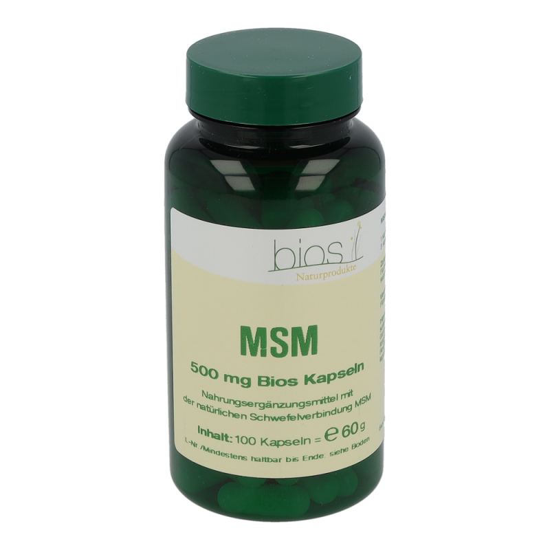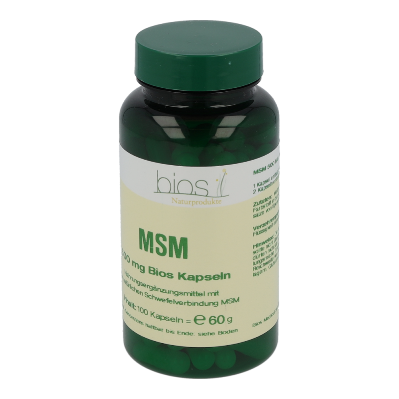 Bios MSM 500 mg Kapseln enthalten 500 mg Methyl-Sulfonyl-Methan in einer Hartgelatinekapsel. MSM ist ein natürlich vorkommender Nährstoff, der vorwiegend in Pflanzen, Fleisch, Eiern, Geflügel und Milchprodukten vorkommt. MSM ist eine Schwefelverbindung und stellt eine biologisch verwertbare Form von Schwefel dar.