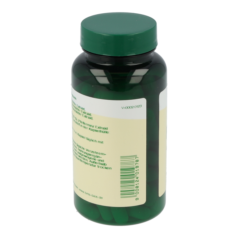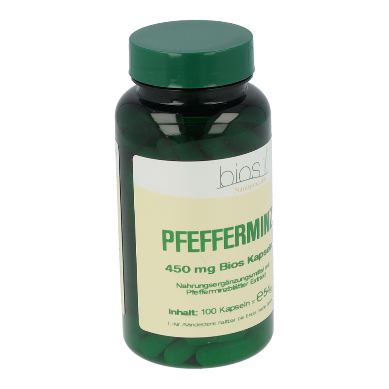 Bios Pfefferminz Kapseln 450 mg enthalten 450 mg eines Trockenextrakts aus Pfefferminzblättern. Verwendet werden die frischen oder getrockneten Blätter der Pfefferminze und das daraus gewonnene ätherische Öl. Dieses besteht aus dem charakteristisch riechenden Menthol, Menthon, Menthylacetat und Menthofuran.