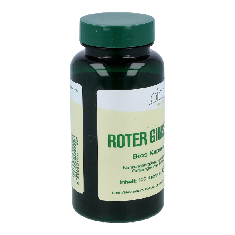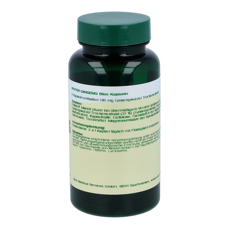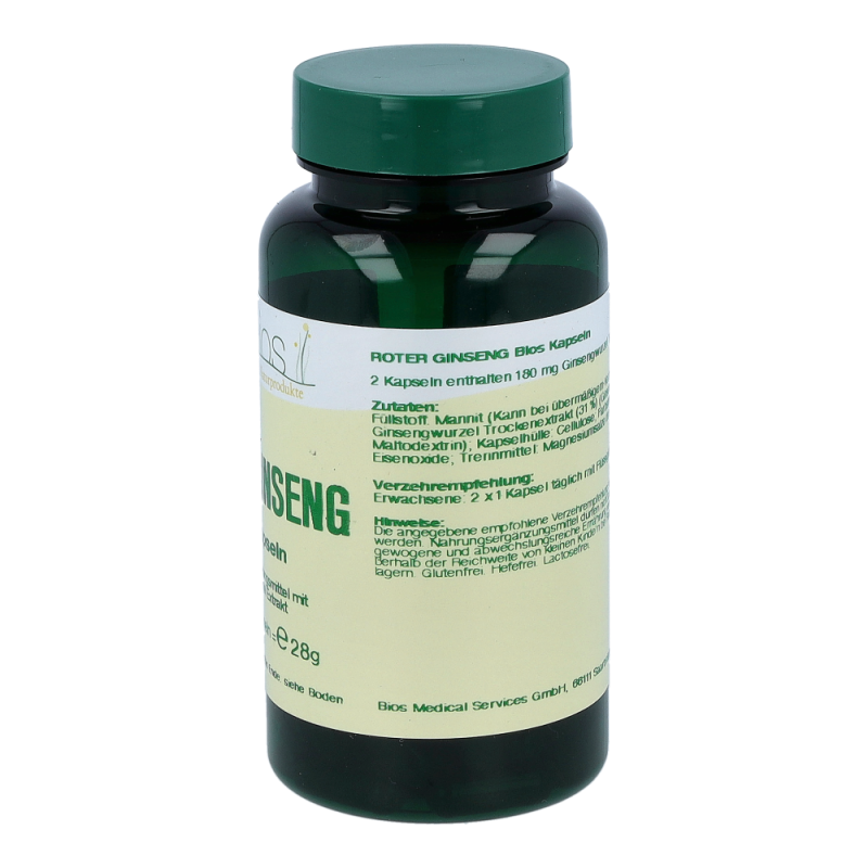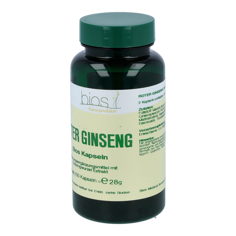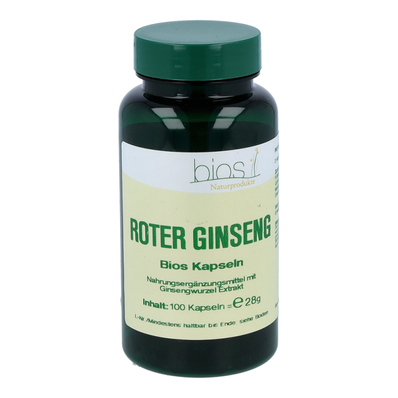 Bios Roter Ginseng Kapseln enthalten 90 mg Trockenextrakt aus Ginsengwurzel in einer Weichgelatinekapsel. Die Hauptinhaltsstoffe der Ginsengwurzel sind die zu den Saponinen gehörenden Ginsenoside. Weiters kommen Fettsäuren, Enzyme, aminosäureähnliche Verbindungen, Polyacetylene, Polysaccharide, Vitamine A, B1, B2, C, ein wenig ätherisches Öl, Mineralien und Spurenelemente vor.