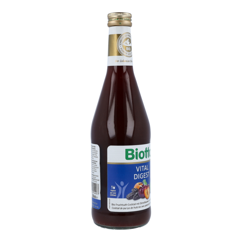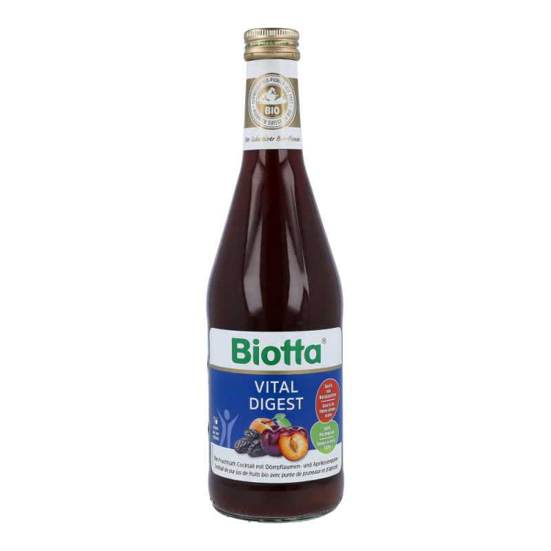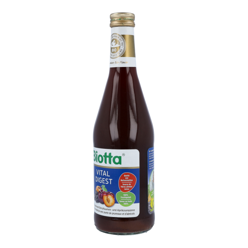 Handverlesene getrocknete Bio-Pflaumen verfeinert mit frischem Pflaumensaft, Traubensaft und Aprikosenpüree machen diese herb-fruchtige Mischung aus. Biotta Vital Digest wird ohne Zugabe von Zucker oder Zuckerzusatzstoffen hergestellt und ist eine Quelle von Ballaststoffen. Für einen schwungvollen Start in den Tag!