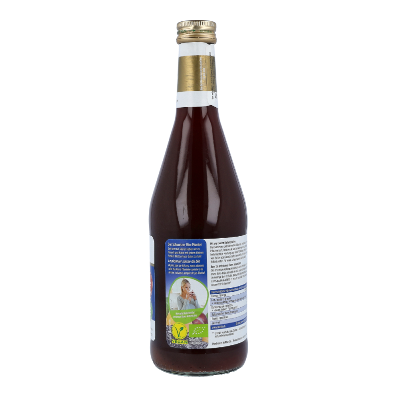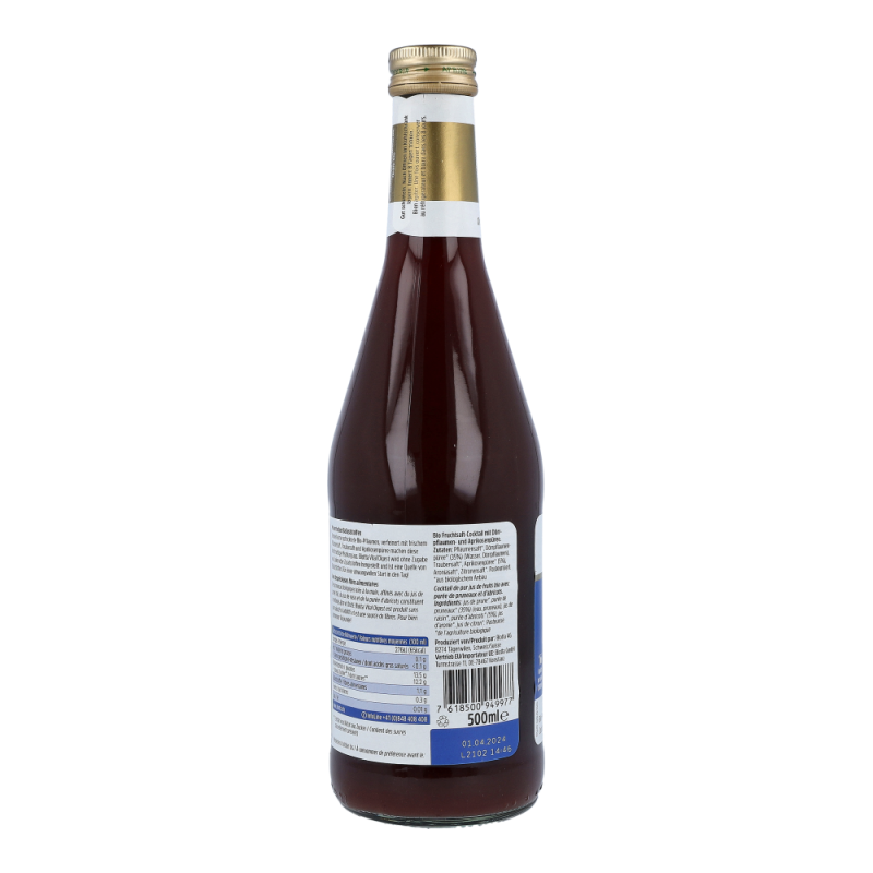Zutaten: Pflaumensaft*, Dörrpflaumenpüree* (35%) (Wasser, Dörrpflaumen), Traubensaft*, Aprikosenpüree* (5%), Aroniasaft*, Zitronensaft*. Pasteurisiert