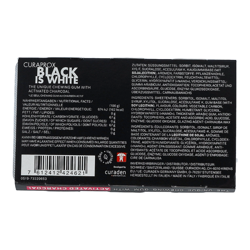 Black is White Kaugummi macht die Zähne dank Aktivkohle weiß. Weitere wertvolle Inhaltsstoffe schützen vor Karies und unterstützen die Mundhygiene. Der limonig-minzige Geschmack ist erfrischend, der Kaugummi zu 100% vegan und frei von Gentechnik.
