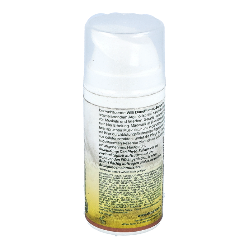 Bei einseitiger Belastung, egal ob vom ewigen Sitzen, falschen Heben oder auch nach dem Sport, braucht die Muskulatur Unterstützung im Abtransport von Stoffwechselabbauprodukten. Der wohltuende Willi Dungl ® BLEIB KRAFTVOLL Phyto-Balsam mit regenerierendem Arganöl ist eine natürliche Pflege im Bereich von Muskeln und Gliedern. Mädesüß ist eine altbewährte Pflanze bei beanspruchter Muskulatur und ergänzt Rosmarin und Kampfer mit ihrer durchblutungsfördernden Eigenschaft. Eine Harmonie aus Kräuterextrakten rundet die Pflege fein ab.