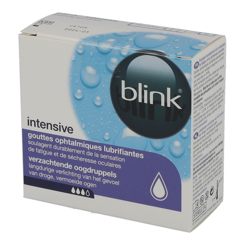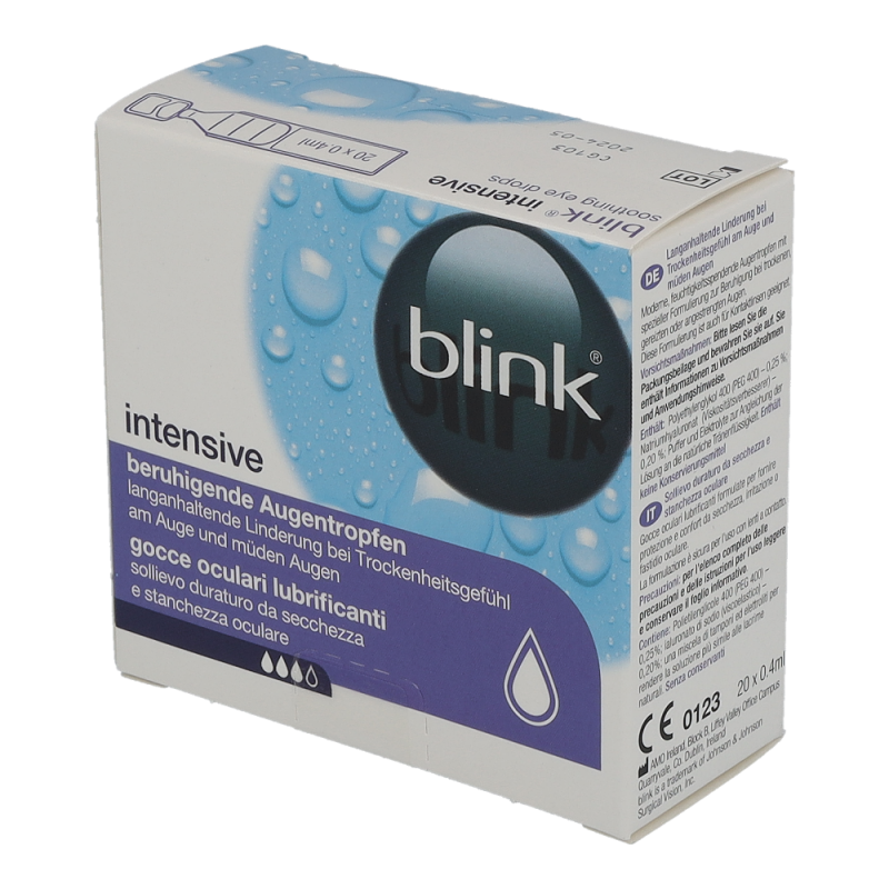Blink Intensiv Tears sind schützende Augentropfen, welche die Feuchtigkeit länger am Auge halten. Die erhöhte Viskosität dieser Augentropfen verlängert die Benetzung und verbessert die Sehqualität. Vergleichsstudien zeigen, dass sie das Schleiersehen zudem deutlich verringern und wieder für klare Sicht sorgen.