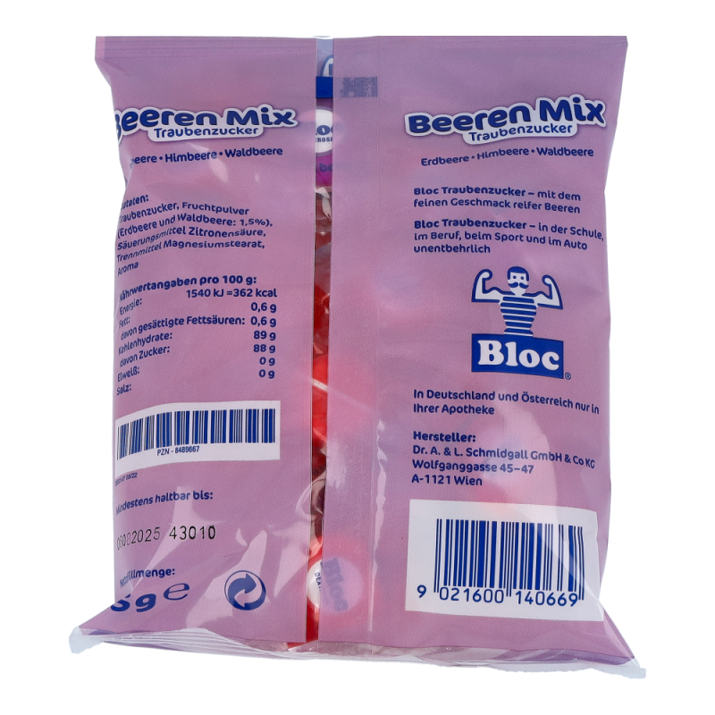 Bloc Traubenzucker Beeren bringt den Körper in Topform! Der Traubenzucker ist ein hochwertiger Energiespender und ideal beim Sport, in der Schule, bei der Hausarbeit, im Büro oder auf Reisen und kommt als kompakte Rolle mit „Aromatresor“ zu Ihnen nach Hause