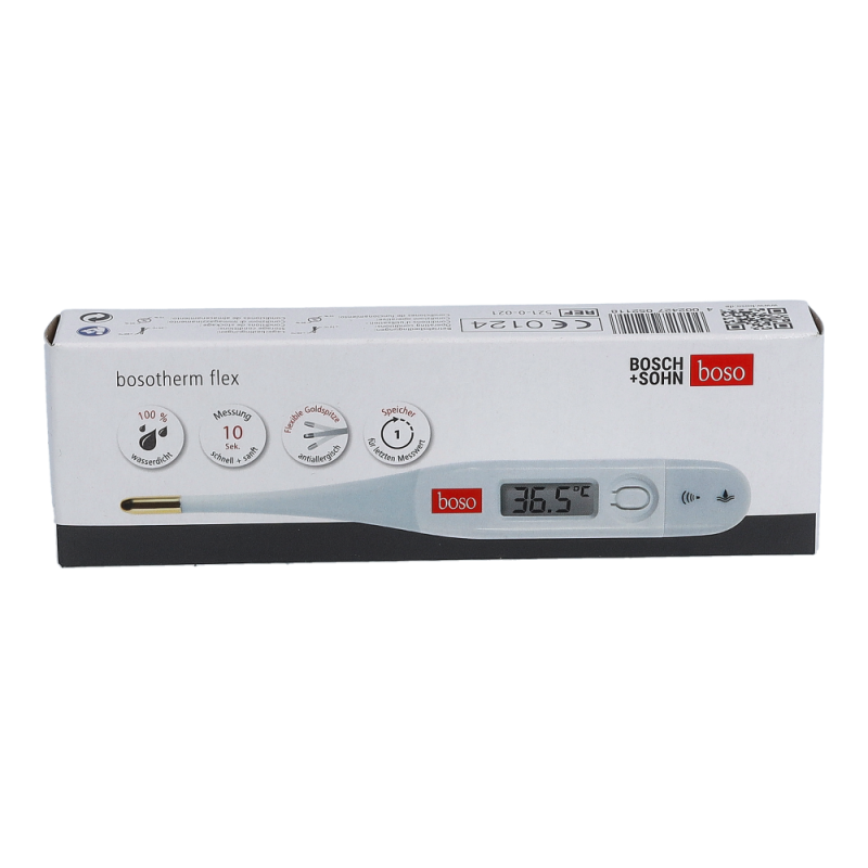 BOSOTHERM® Flex Fieberthermometer bietet eine sanfte und schnelle Messung in nur 10 Sekunden. Mit flexibler Spitze, antiallergischer Goldbeschichtung und Speicher für den letzten Messwert. 100% wasserdicht.