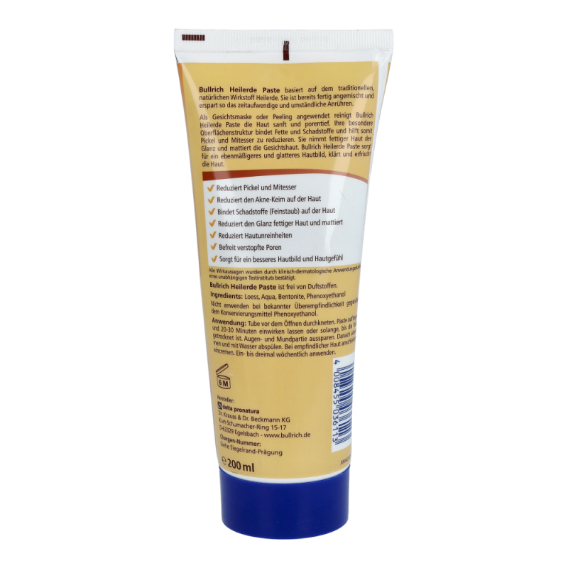 Bullrich Heilerde Paste dient der unterstützenden Behandlung von Muskel- und Gelenksbeschwerden, wie etwa bei Rheuma und Gicht. Die Paste verschafft auch Abhilfe bei Sportverletzungen, Hautproblemen, wie etwa Akne, und auch Hautentzündungen oder oberflächlichen Entzündungen der Venen (Krampfadern).