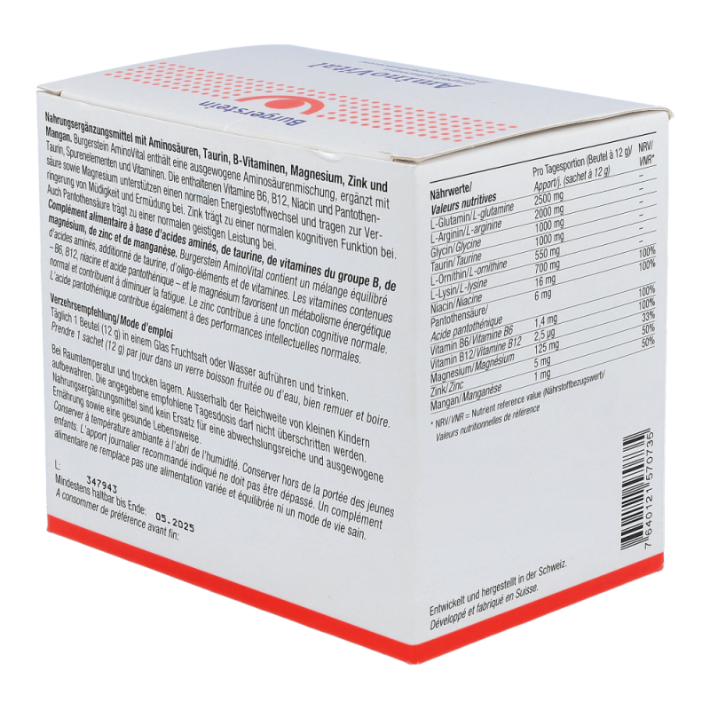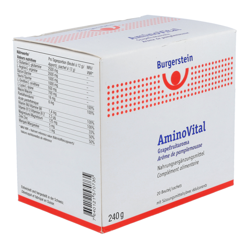 Burgerstein Aminovital Sachets enthalten eine Auswahl spezieller Aminosäuren für die gezielte Unterstützung des Hirnstoffwechsels. Dieses Produkt dient für den Aufbau und die schnellere Erholung während oder nach Stress-Situationen, wie zum Beispiel im Sport. Außerdem erhöht Aminovital die mentale Fitness und die Konzentrationsfähigkeit. Weniger Müdigkeit, mehr Energie.