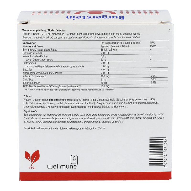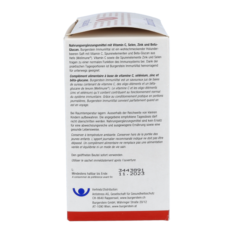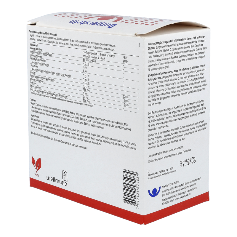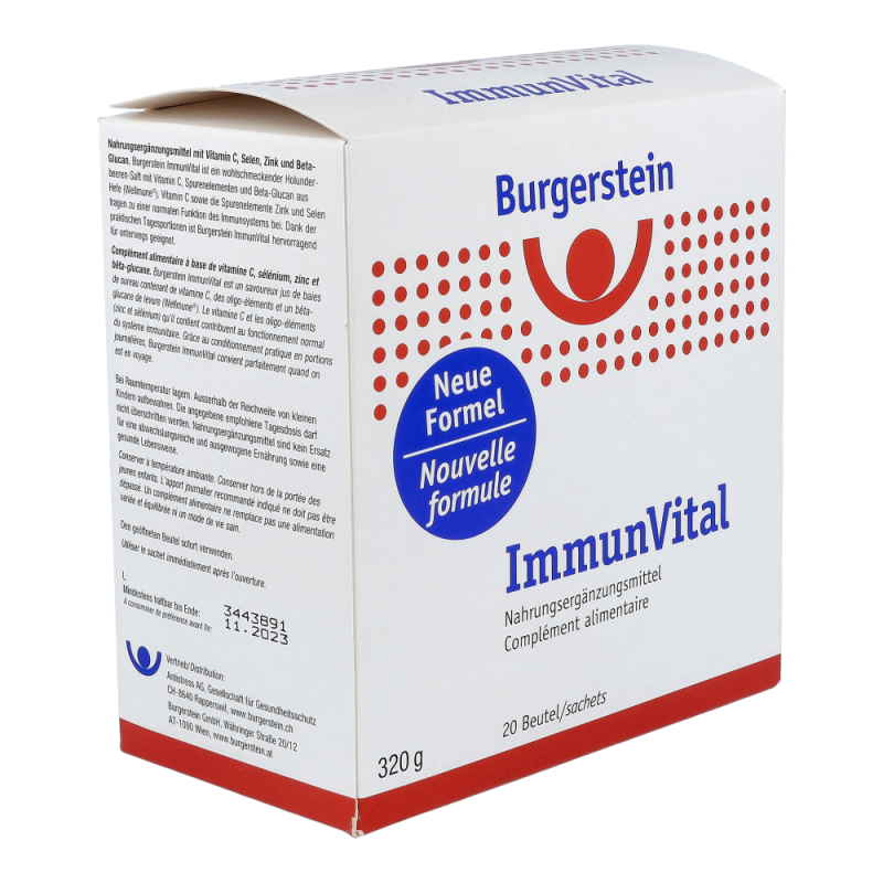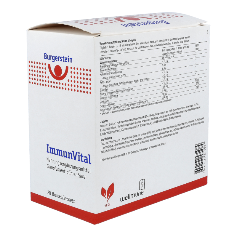 Burgerstein ImmunVital Beutel 20 Stk. mit Vitaminen, Spurenelementen und Beta-Glucan aus Hefe (Wellmune®) unterstützen das Immunsystem. Die in den praktischen Beuteln enthaltenen Vitamine A, C und D sowie die Spurenelemente Zink und Selen eignen sich hervorragend für die Einnahme unterwegs – ideal für die ganze Familie – jetzt stark preisreduziert bestellen!