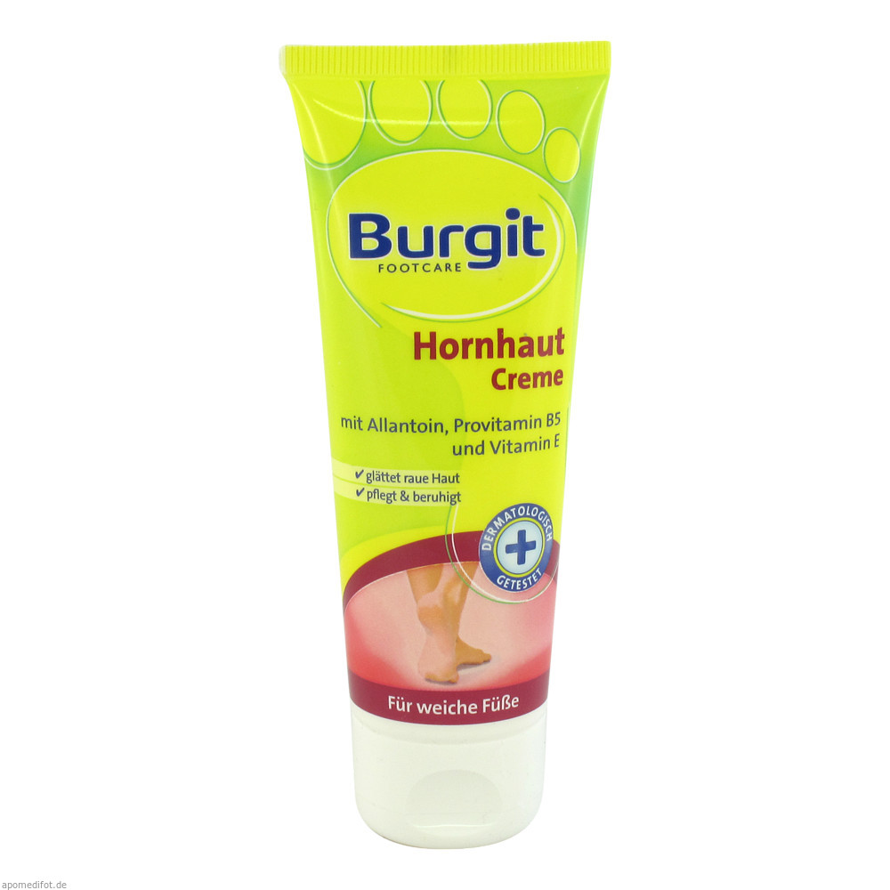 Burgit Hornhaut Creme glättet raue und verhornte Haut und macht die Füße geschmeidig weich. Verhornte Haut wird entfernt und die Neubildung der Hornhaut wird gehemmt. Allantoin und Provitamin B glätten raue Haut und pflegen intensiv. Wirkt sofort und langanhaltend alle Produkte von Burgit mit hohem Rabatt bestellen!