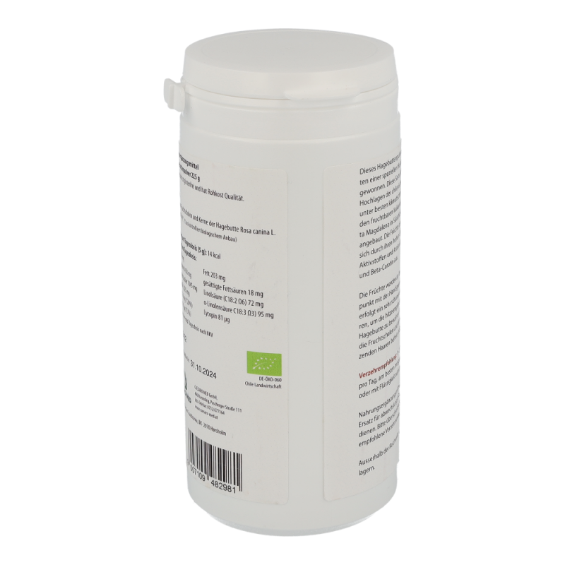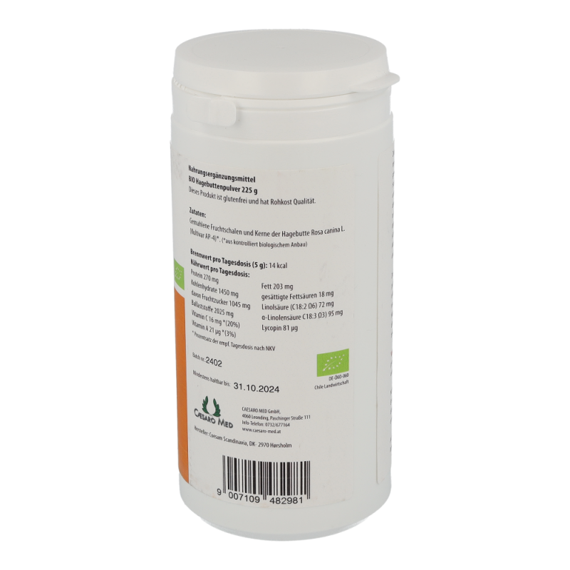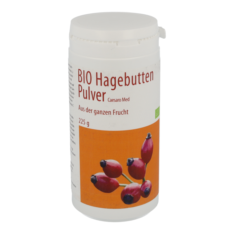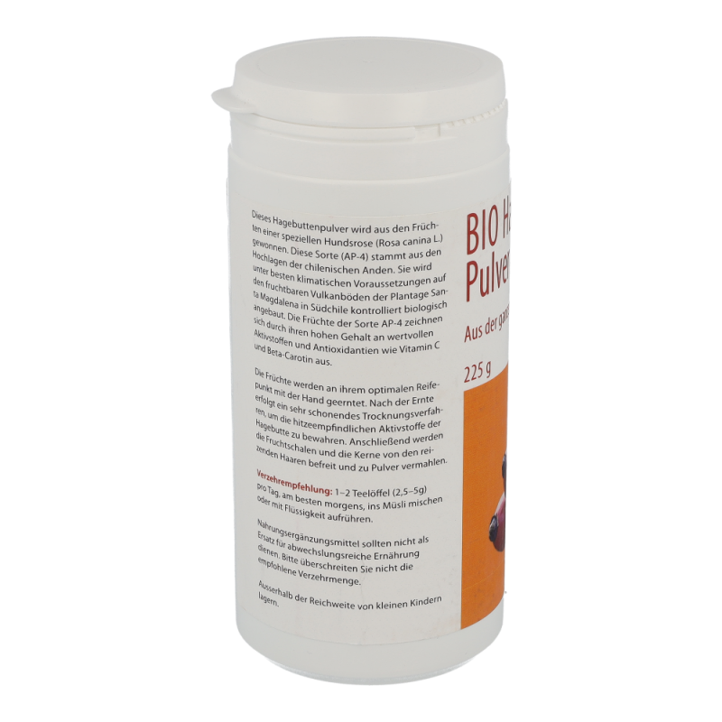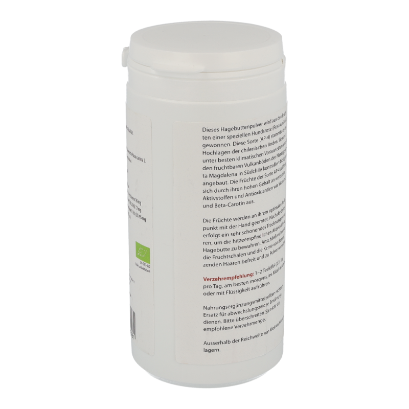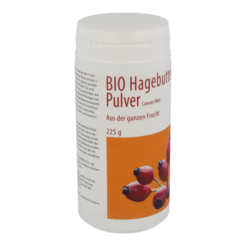 Caesaro Hagebuttenpulver wird aus den Früchten einer speziellen Hundsrose (Rosa canina L.) gewonnen. Diese Sorte (AP-4) stammt aus den Hochlagen der chilenischen Anden. Sie wird unter besten klimatischen Voraussetzungen auf den fruchtbaren Vulkanböden der Plantage Santa Magdalena in Südchile kontrolliert biologisch angebaut. Die Früchte der Sorte AP-4 zeichnen sich durch ihren hohen Gehalt an wertvollen Aktivstoffen und Antioxidantien wie Vitamin C und Beta-Carotin aus. Die Früchte werden an ihrem optimalen Reifepunkt mit der Hand geerntet. Nach der Ernte erfolgt ein sehr schonendes Trocknungsverfahren, um die hitzeempfindlichen Aktivstoffe der Hagebutte zu bewahren. Anschließend werden die Fruchtschalen und die Kerne von den reizenden Haaren befreit und zu Pulver vermahlen.