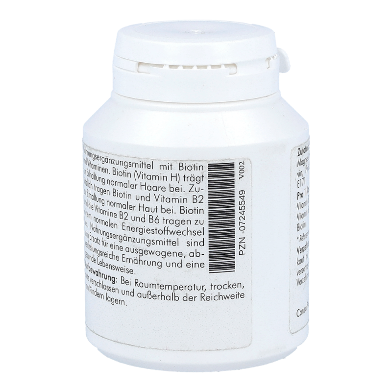 Biotin – auch Vitamin H  genannt – unterstützt den normalen Haarwuchs. Gemeinsam mit Vitamin B2 und B6 wird der Energiestoffwechsel angeregt und der Erhalt normaler Haut positiv beeinflusst.