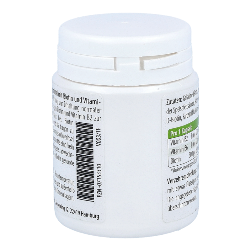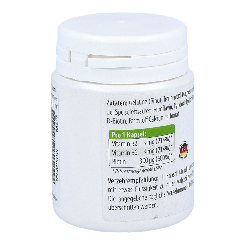 1 Kpasel täglich enthält: Biotin 300 myg, Vitamin B2 3 mg, Vitamin B6 3 mg.