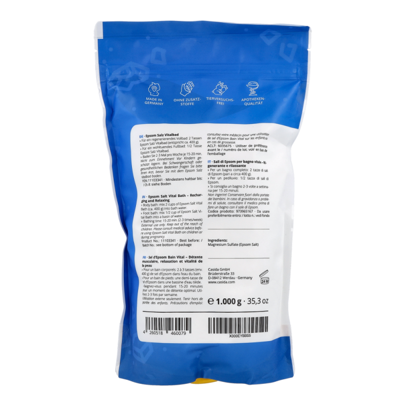 Casida Epsom Salz Vitalbad ist ein magnesiumreicher Badezusatz für Fuß- und Vollbäder. Regenerierend und entspannend für Körper und Geist.
