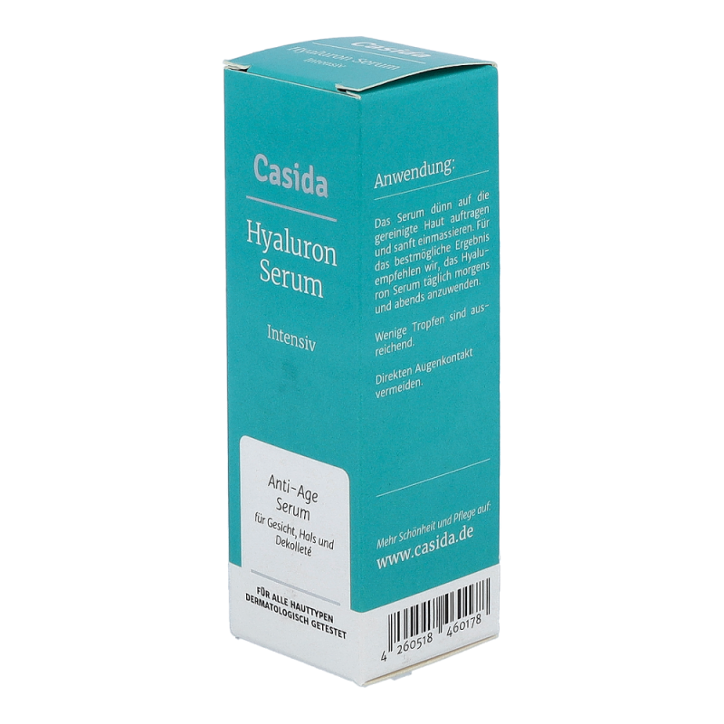 Casida Hyaluron Serum Intensiv ist ein hochdosiertes Anti-Aging Serum für Gesicht, Hals und Dekolleté. Das Hyaluron Serum erhöht die Spannkraft der Haut und wirkt gegen Falten und Fältchen, Augenringe und Altersflecken. Für ein jüngeres und frischeres Hautbild.